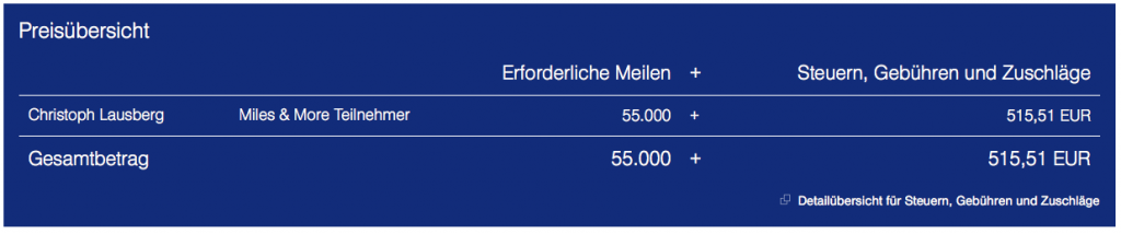 Wenn Ihr die 438,20 Euro für die Meilen und die 515,51 Euro für die Steuern und Gebühren nun addiert, könnt Ihr so für 953,71 Euro in die USA fliegen und zwar in der bequemen Lufthansa Business Class.