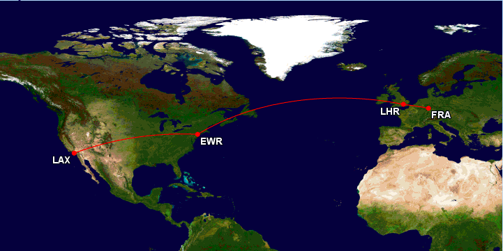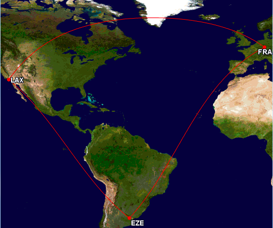 - Frankfurt-Los Angeles // Buenos Aires- Frankfurt ( Open- Jaw und ERLAUBT, da LAX-EZE mit 6.115 Meilen kürzer ist, als EZE-FRA mit 7.133 Meilen)