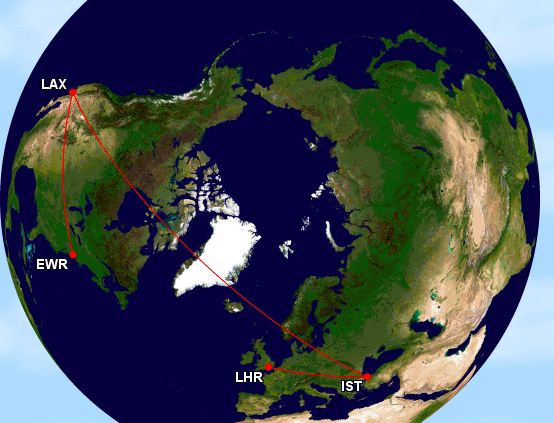 Einen Flug von London nach New York kann man auch „über“ Istanbul und Los Angeles routen. Voraussetzung: Der Aufenthalt in Istanbul und New York ist unter 24 Stunden. Ein Stop Over ist in diesem Fall wegen des Back Trackings nicht mehr möglich. Startpunkt dieses Routings ist London und der Point of Turn Around ist in diesem Fall New York.