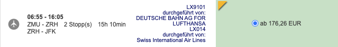 Es handelt sich hier um einen Economy Tarif, vereinzelt ist das Routing bereits für unter 300€ zu haben. Die Flüge werden von Swiss bzw. Lufthansa durchgeführt, zur Wahl stehen der Flughafen JFK in New York sowie EWR in Newark, New Jersey.