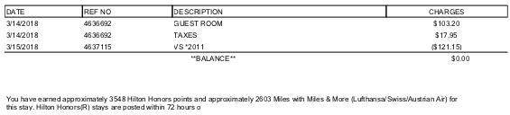 So konnte man in den letzten drei Monaten pro Übernachtung bis zu 4.000 Hilton Punkte UND 2.500 Miles&More Meilen sammeln. Diese Aktionen waren miteinander kombinierbar und ich sammelte z.B. bei einer Nacht für 121,15 US$ Endpreis 6.548 Hilton Honors Punkte und 2.603 Miles&More Meilen. Dies ist natürlich ein unglaublich hoher „Return“ für solch eine günstige Übernachtung.