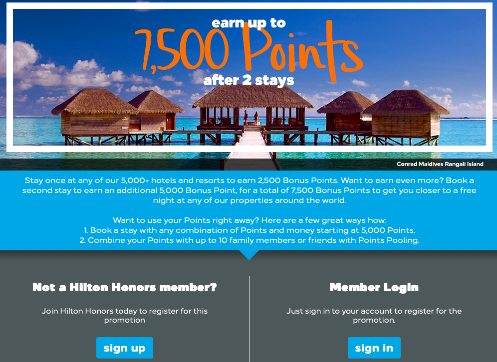Um die 7.500 extra Punkte für die nächsten beiden Hilton Stays zu erhalten, müsst Ihr Euch für diese Promotion einmalig vor Eurem Aufenthalt registrieren. Danach bekommt Ihr für die ersten zwei Stays in einem Hilton Hotel weltweit bis 31. Januar 2020 die Bonuspunkte gutgeschrieben.