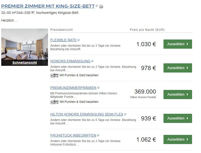 Ebenfalls lohnt sich die Einlösung von Hilton Honors Punkten meist nicht, wenn nur noch Premium Room Rewards verfügbar sind. Diese betragen häufig ein vielfaches des Punktewertes für ein Standardzimmer und sind damit selten billiger als eine bezahlte Zimmerrate. Aber es gibt Ausnahmen. Denn es kann auch durchaus passieren, dass der Preis für einen Premium-Room Reward niedriger ist als für ein Standardzimmer. Es scheint so, als würden die Premium-Zimmer weniger oder gar nicht dynamisch angepasst. Als lasst diese Option in der Hochsaison nicht ganz links liegen.