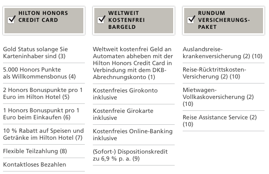Die Hilton Kreditkarte kommt in verschiedenen Erweiterungsoptionen daher. Neben der reinen Hilton Kreditkarte, könnt Ihr sie auch mit einem kostenlosen DKB Girokonto, und einem optionalen Versicherungspaket bestellen. Dies bringt zwar alles weitere Vorteile, ist aber auch nicht für jeden nötig.