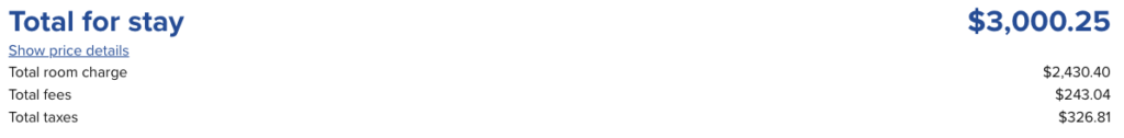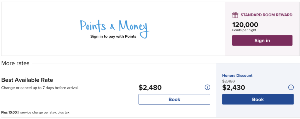 Selbst mit der Aktion kosten 120.000 Punkte immer noch 600$- kein Schnäppchen. Im Vergleich zum Normalpreis jedoch ein guter Deal! Besonders wenn man bedenkt, dass bei der Normalbuchung Steuern und eine Service Charge berechnet werden. Der Endpreis liegt dann bei 3.000$ / Nacht.