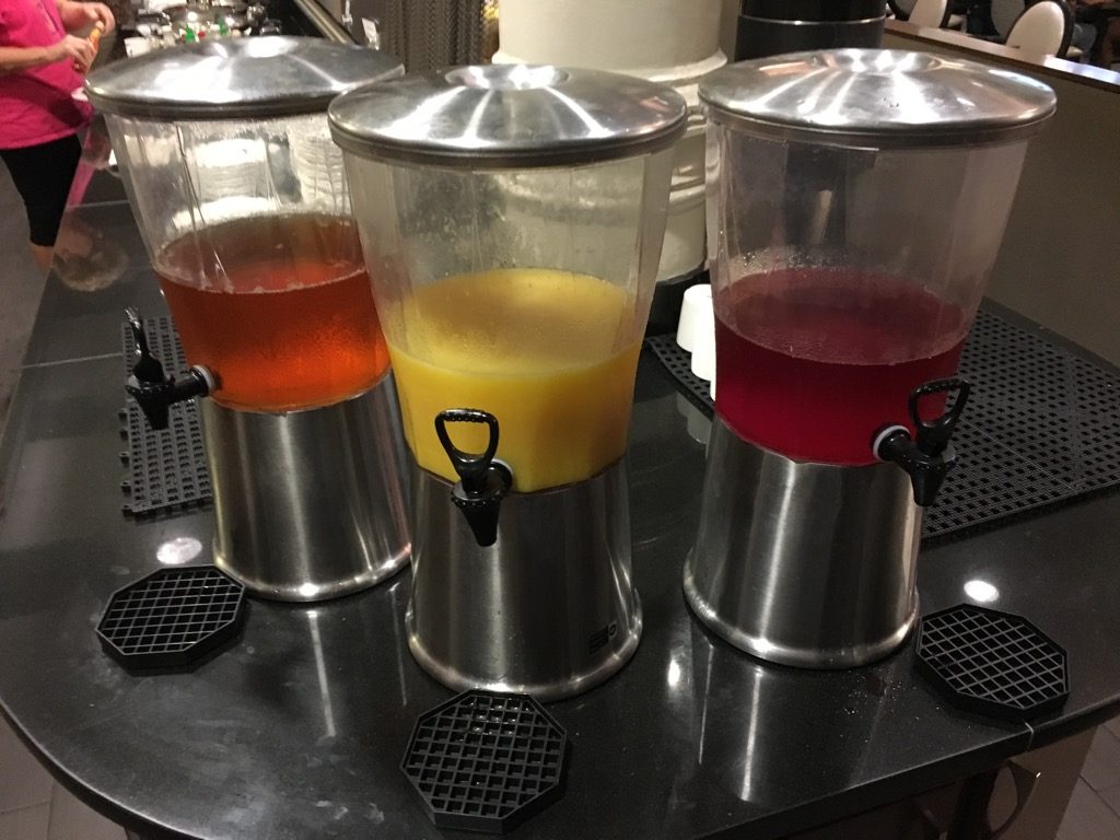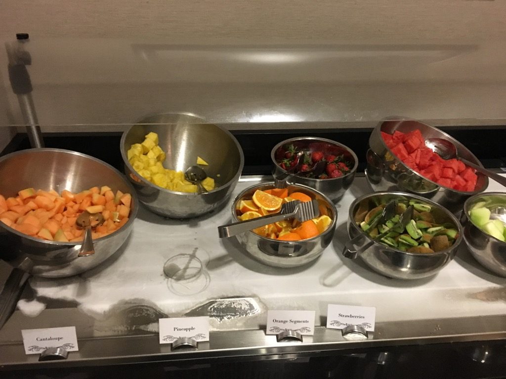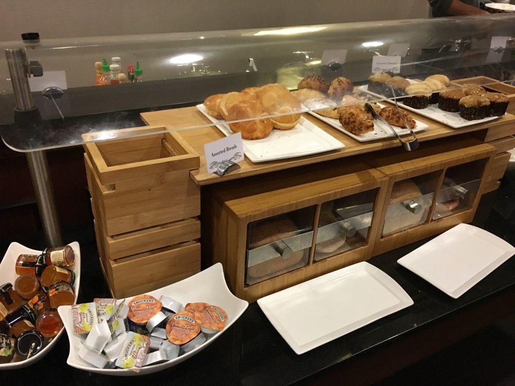 Die Auswahl auf dem Buffet entsprachen dem 20 US$ USA Buffet Frühstück. Neben Toast, Bagles, Müsli, süßen Teilchen und Obst, gab es auch warme Speisen wie Rührei, Würstchen, Frühstückskartoffeln, sowie Frenchtoast auf dem Buffet. An einer Omelett Station wurden von einem Koch auch frische Omeletts zubereitet.