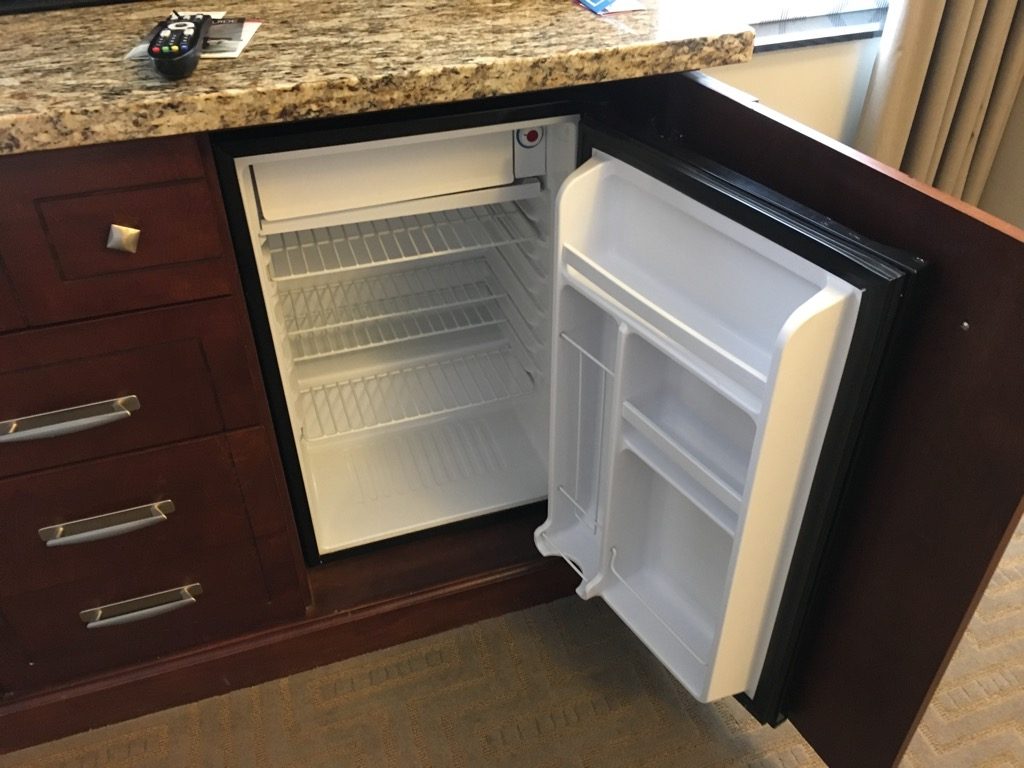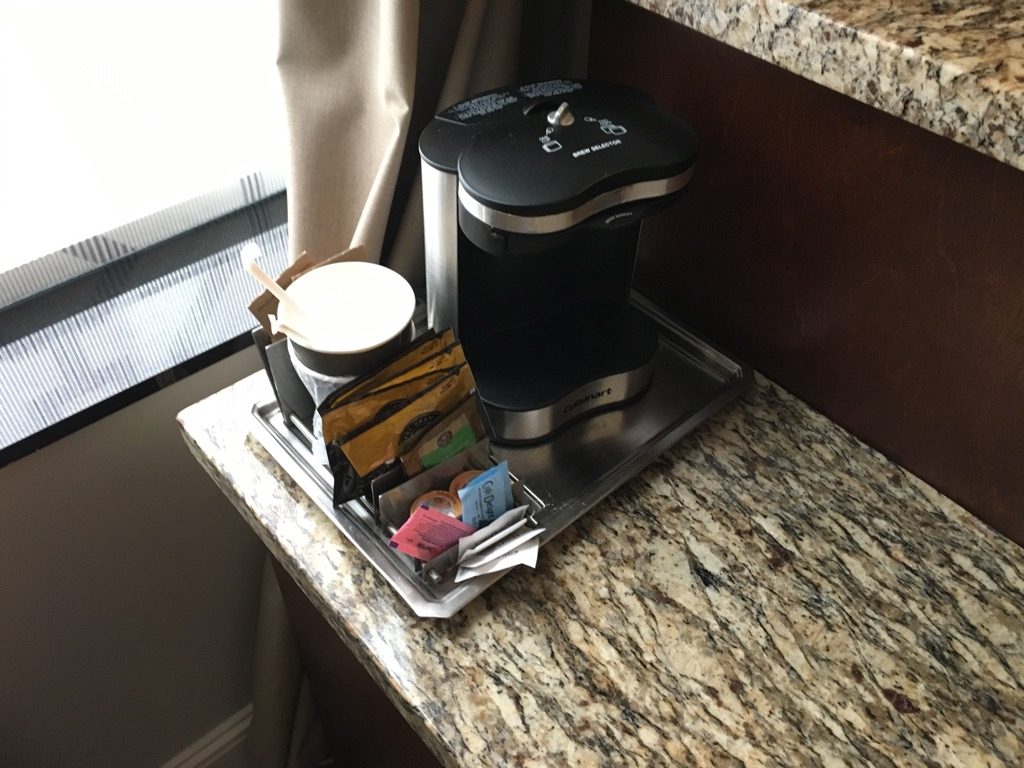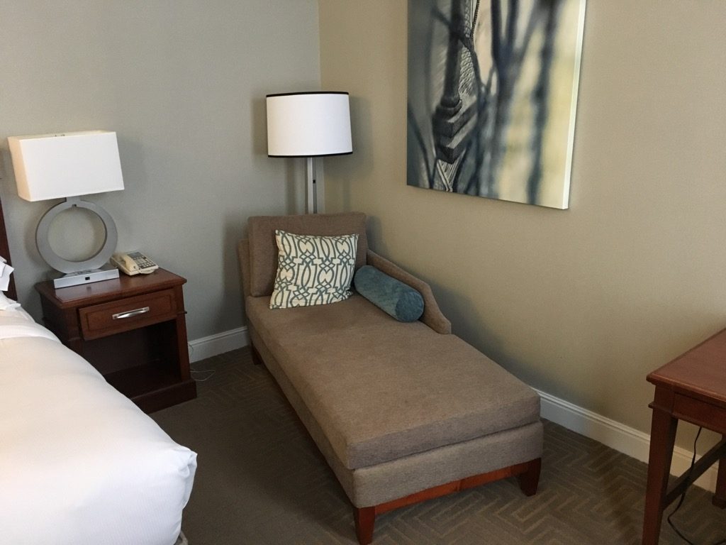 Neben dem Bett befand sich noch eine Liege, sowie ein kleiner Schreibtisch mit Stuhl. Gegenüber des Bettes gab es noch die übliche Kommode, mit Fernseher, Kaffeemaschine und leerem Kühlschrank. In den USA haben Hilton Hotels quasi keine Minibar mehr. Wer etwas haben möchte, kann dies zu den üblichen horrenden Preisen beim Roomservice bestellen.