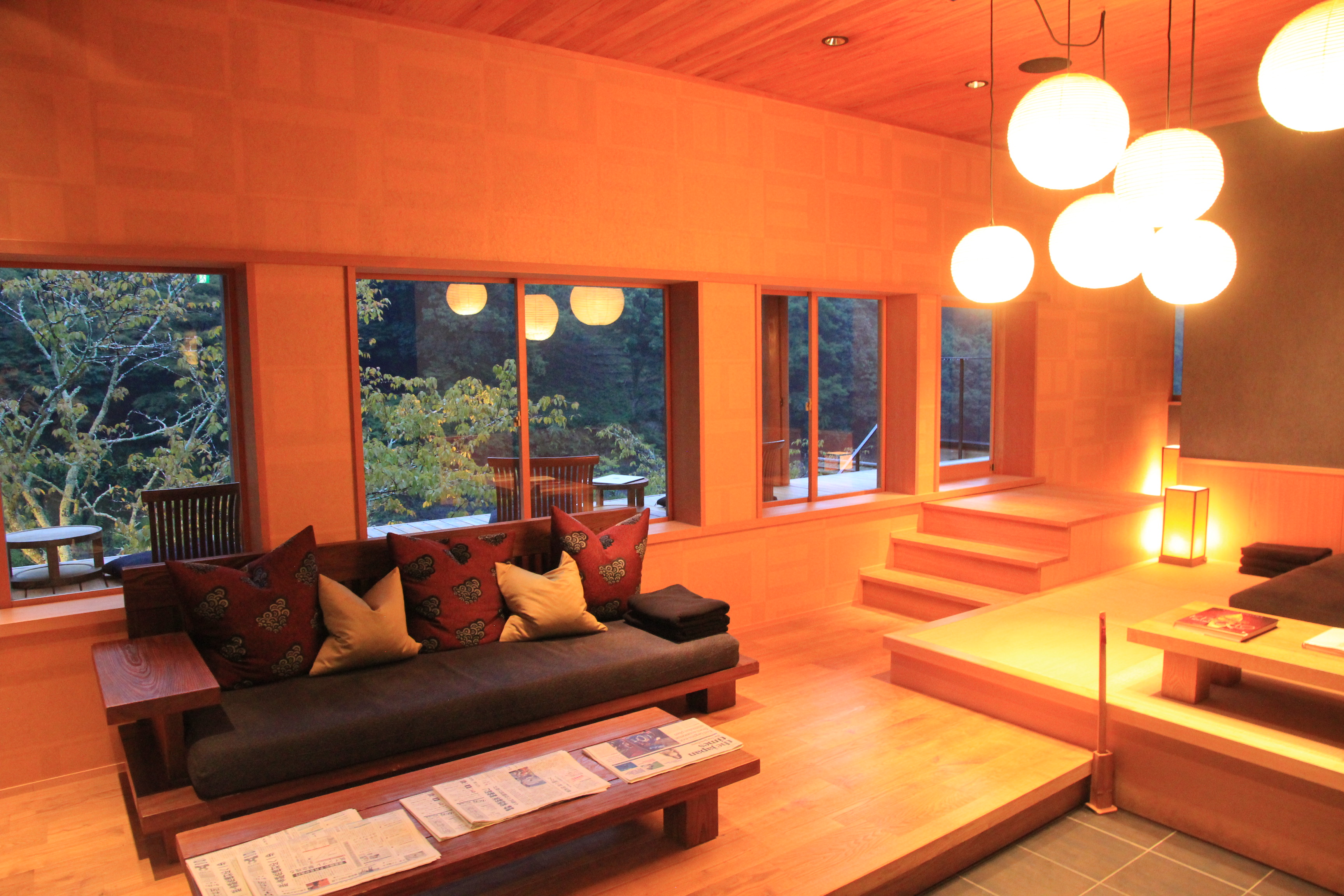 Im zweiten Gebäude auf der rechten Seite befindet sich die Rezeption und Lobby. Wobei es nicht wirklich eine Lobby im klassischen Sinn ist. Vielmehr handelt es sich um einen Bereich, in dem sich die Gäste treffen können oder um zu entspannen. Im Außenbereich befindet sich eine kleine Terrasse mit einer wunderbaren Aussicht auf den Fluss und den gegenüberliegenden Wald.