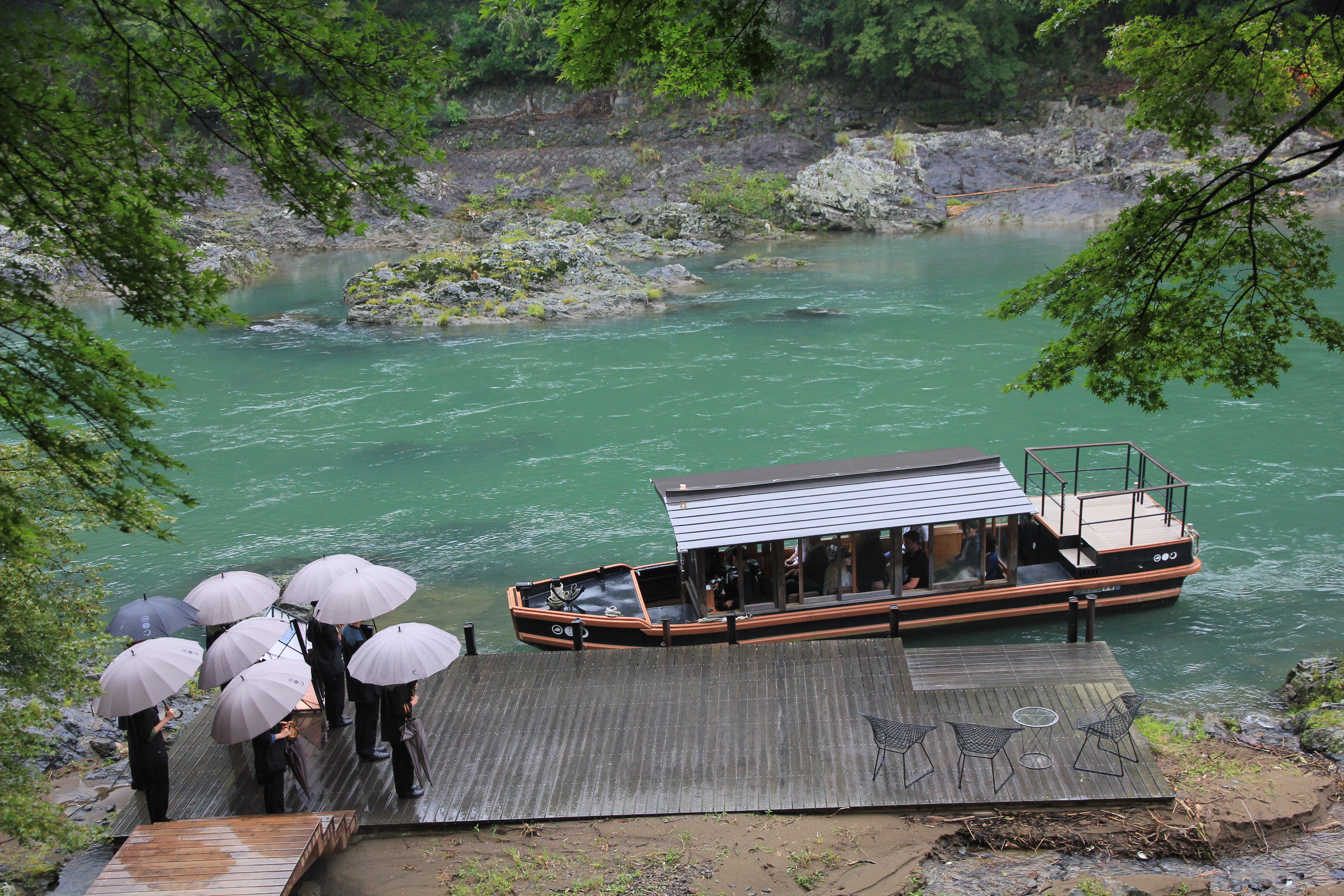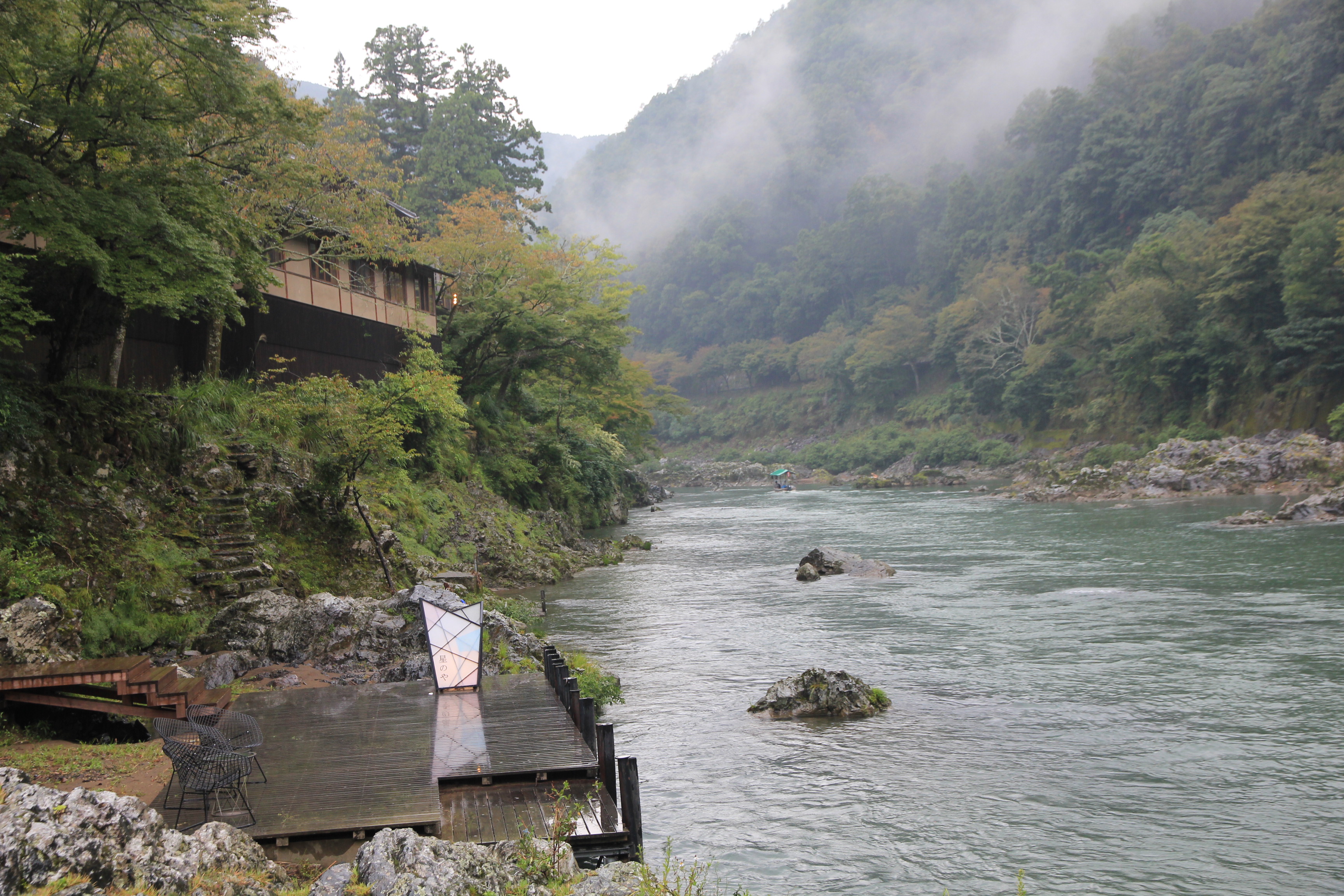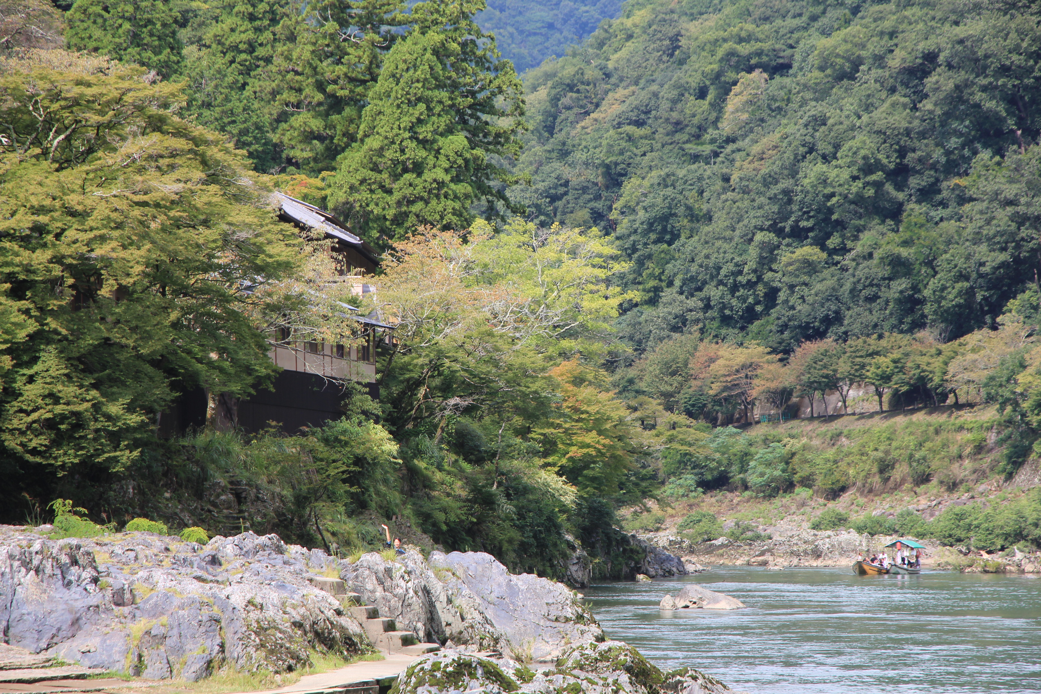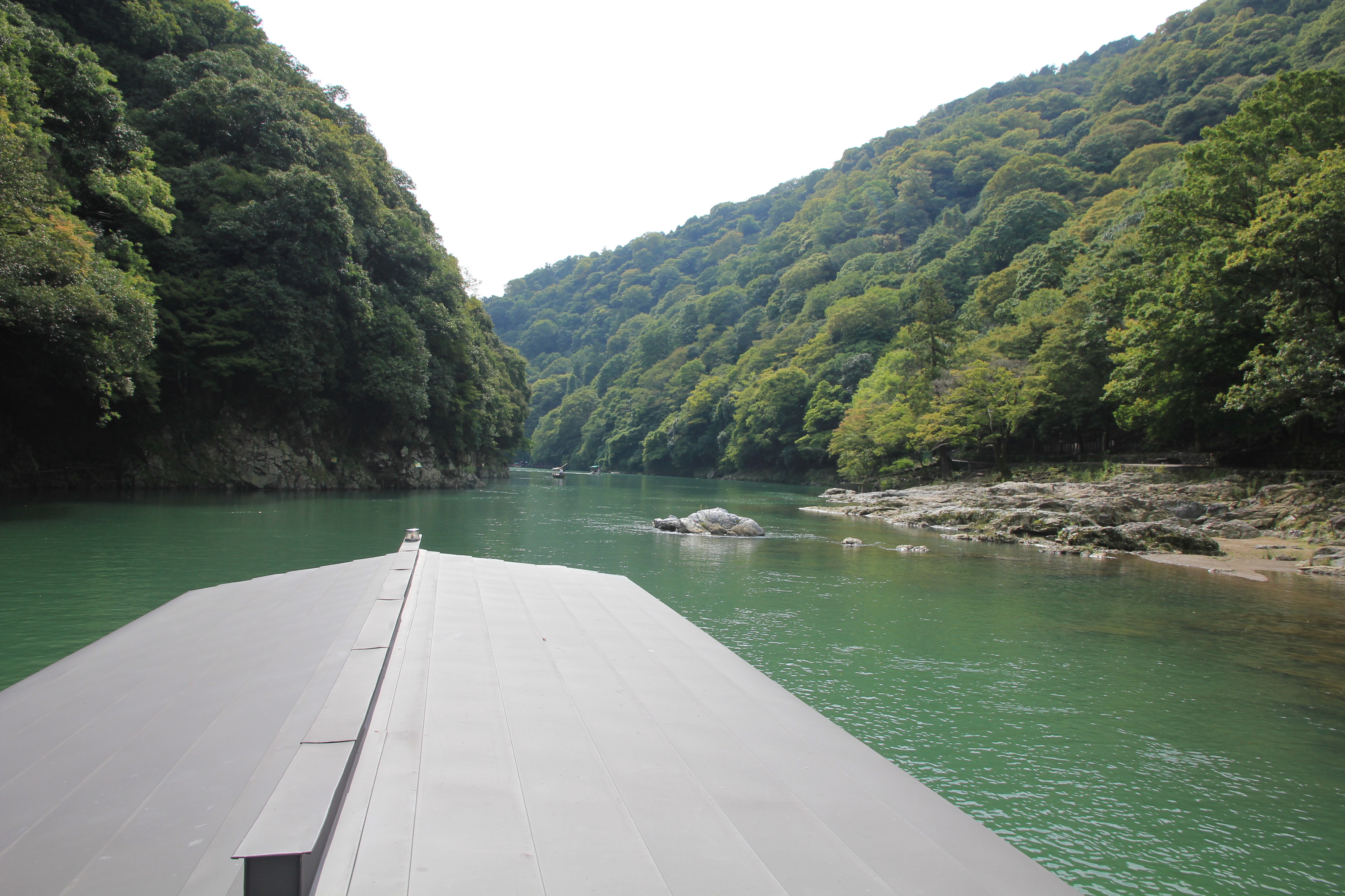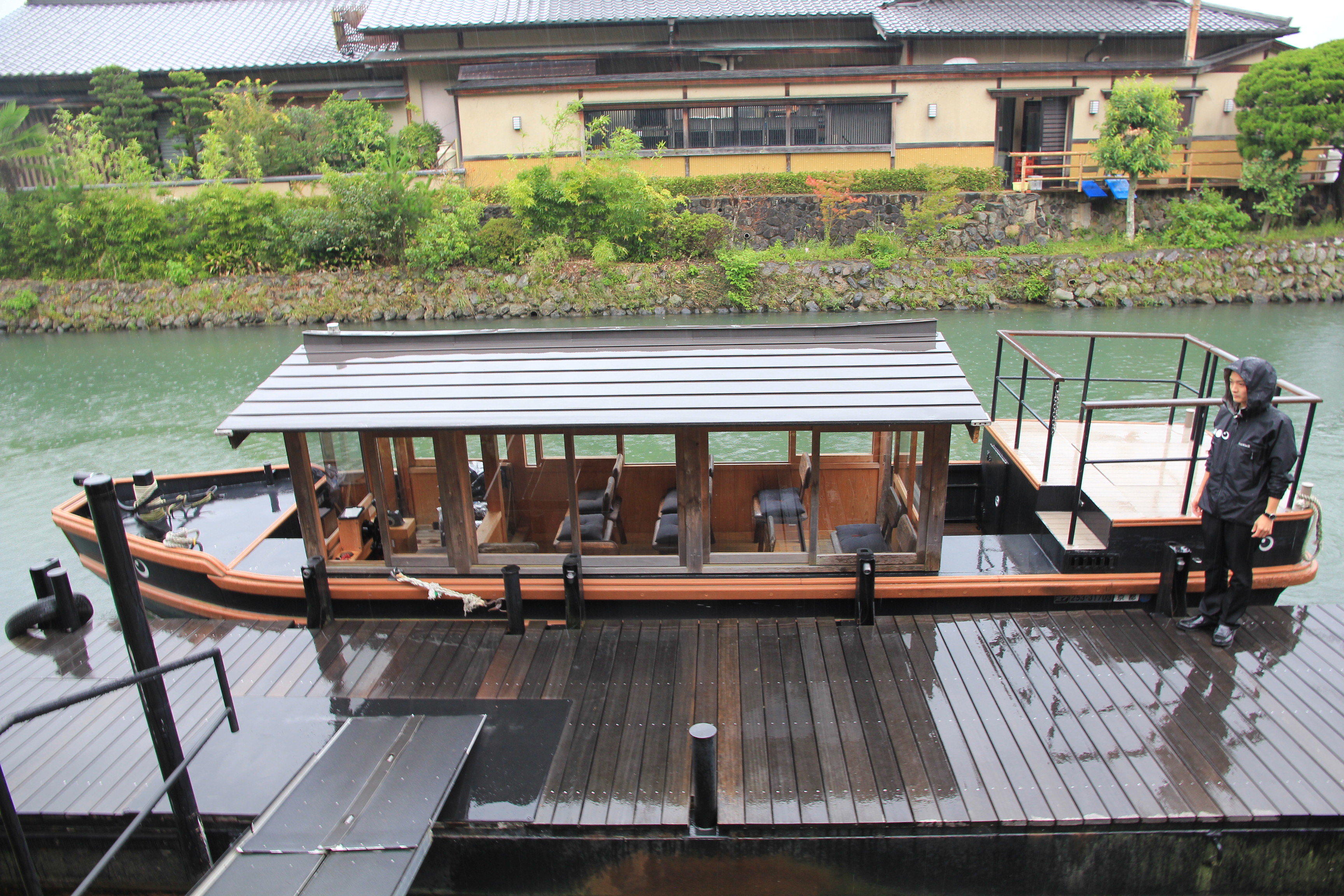 Nachdem ich am späten Vormittag ausgecheckt hatte, ging es für mich mit dem Shinkansen nach Kyoto. Für die gut 500 Kilometer braucht man mit dem japanischen Bullet Train nur gut 2 Stunden. Vom Bahnhof in Kyoto kann man entweder ein Taxi nehmen, das braucht dann knappe 30 Minuten, oder man fährt mit der Regionalbahn weiter. Letztere Option habe ich gewählt. Nach 10 Minuten Fußweg durch ein altes, historisches und entspanntes Viertel kam ich dann am Fluss an. Hier befindet sich das „Wartezimmer“ vom HOSHINOYA Kyoto. Man checkt hier nämlich ein, bevor man mit dem hoteleigenen Boot flussaufwärts zum Hotel gefahren wird. Nach circa 15 Minuten und einer wunderschönen Tour durch ein kleines Tal kommt man am Bootssteg des Hotels an.