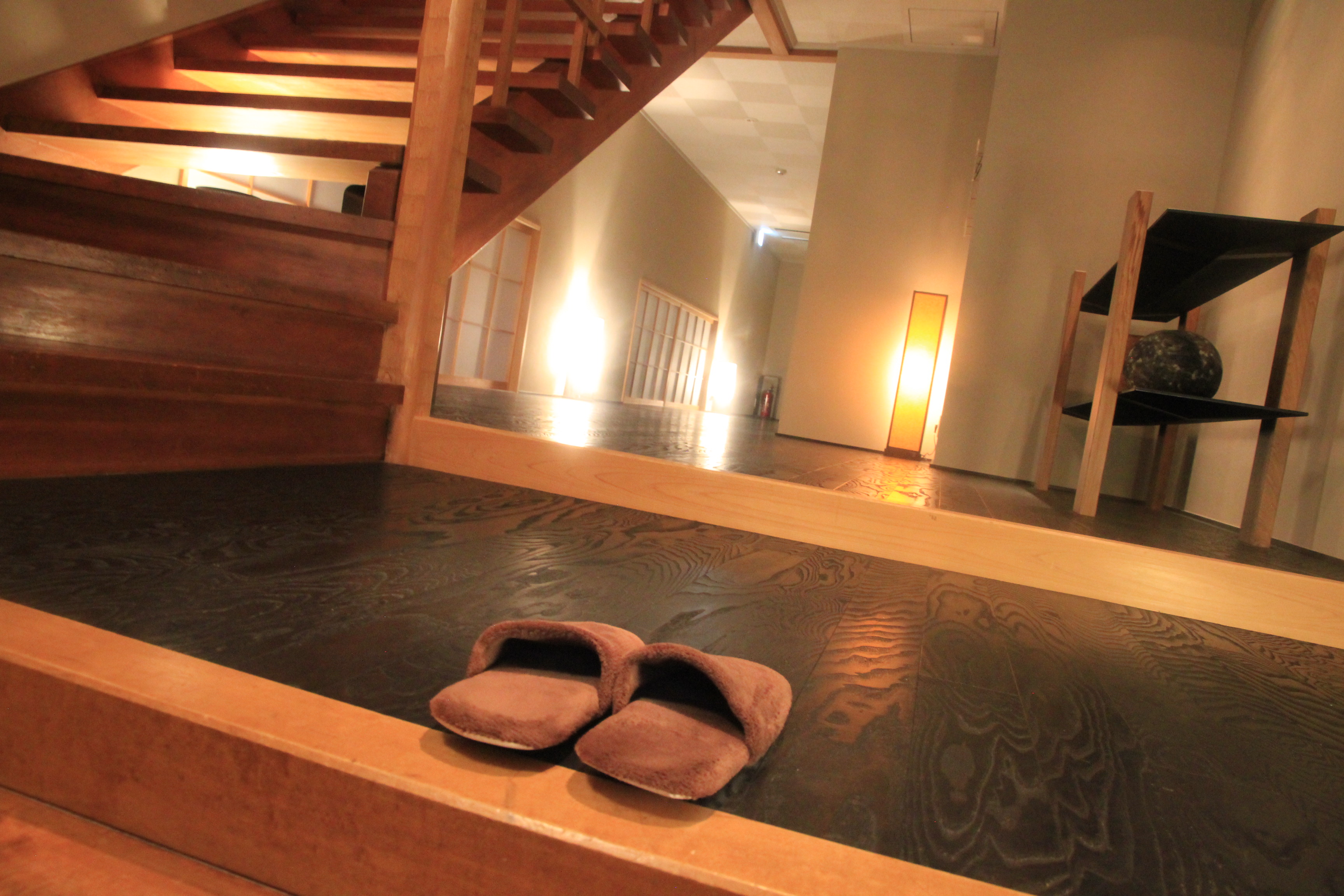 Mein Zimmer hat sich im ersten Stock des Gebäudes befunden. Wie auch im HOSHINOYA in Tokio, betritt man das Gebäude nicht mit Schuhen. Hier stehen den Gästen bequeme Pantoffeln zu Verfügung.