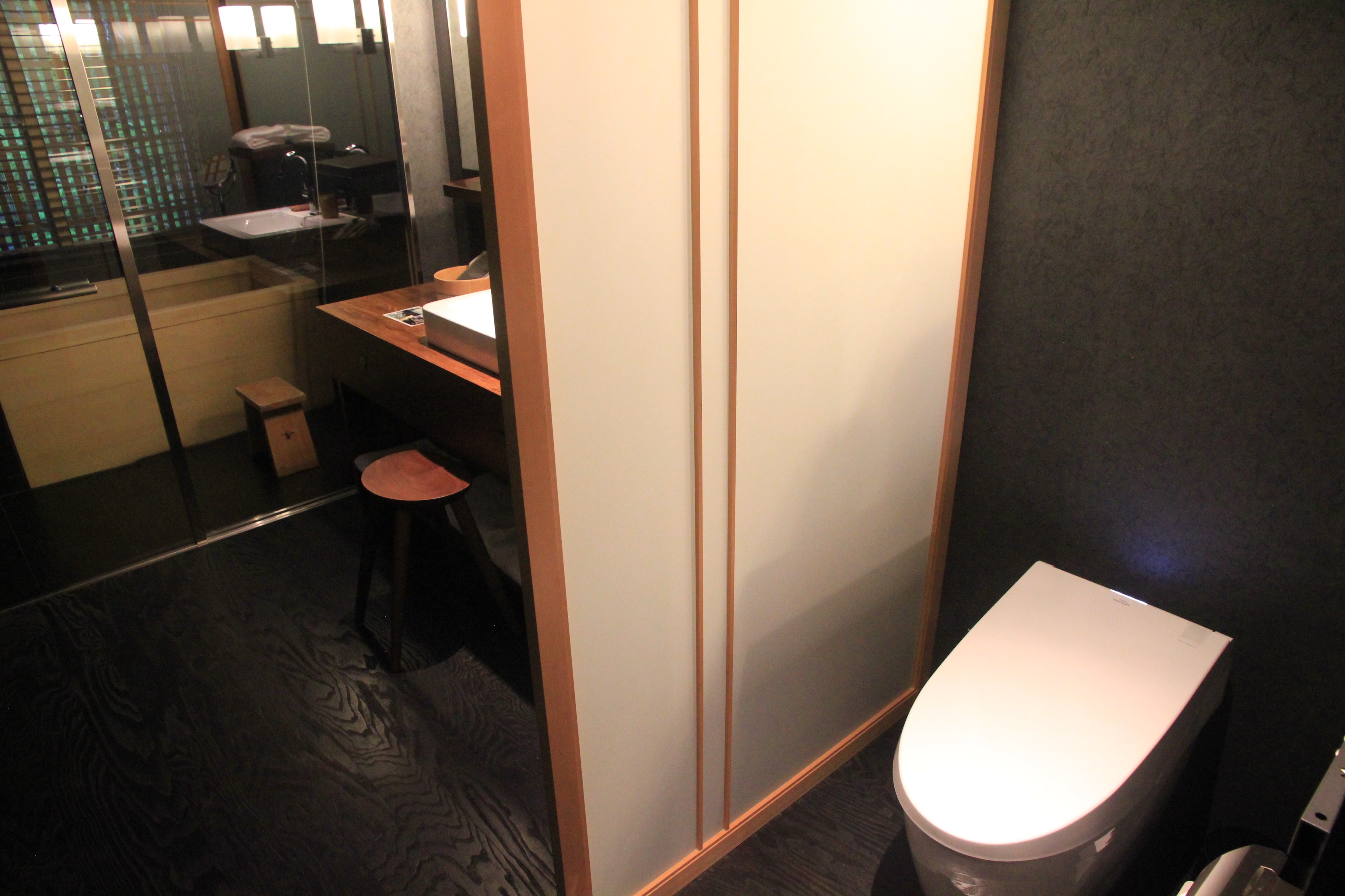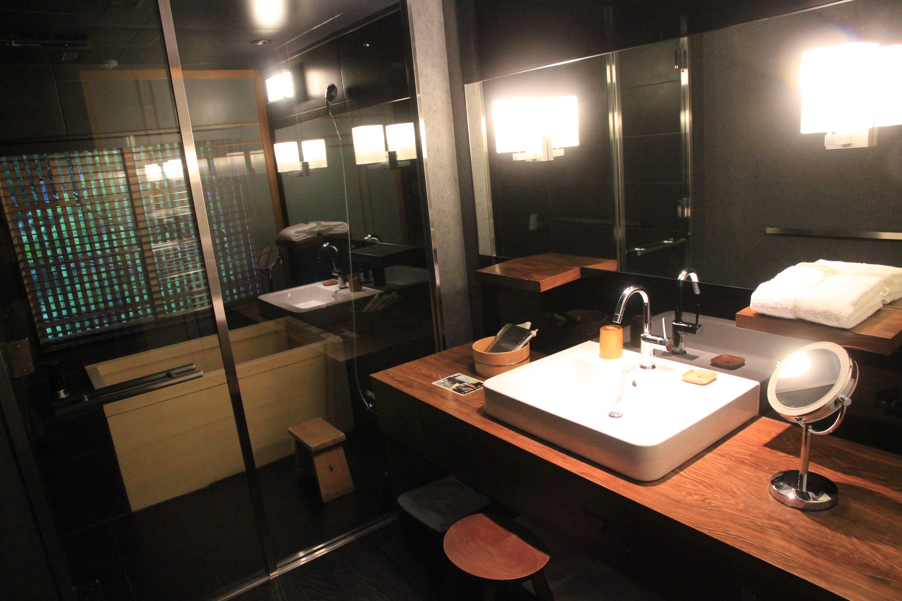 Die Dusche ist durch eine Glaswand vom Bad abgetrennt. Hier befindet sich ähnlich wie in einem Onsen eine Badewanne aus Holz, sowie die üblichen kleinen Hocker, auf die man sich beim Waschen setzt. Aus diesem Grund waren auch die Amaturen sehr niedrig angebracht.