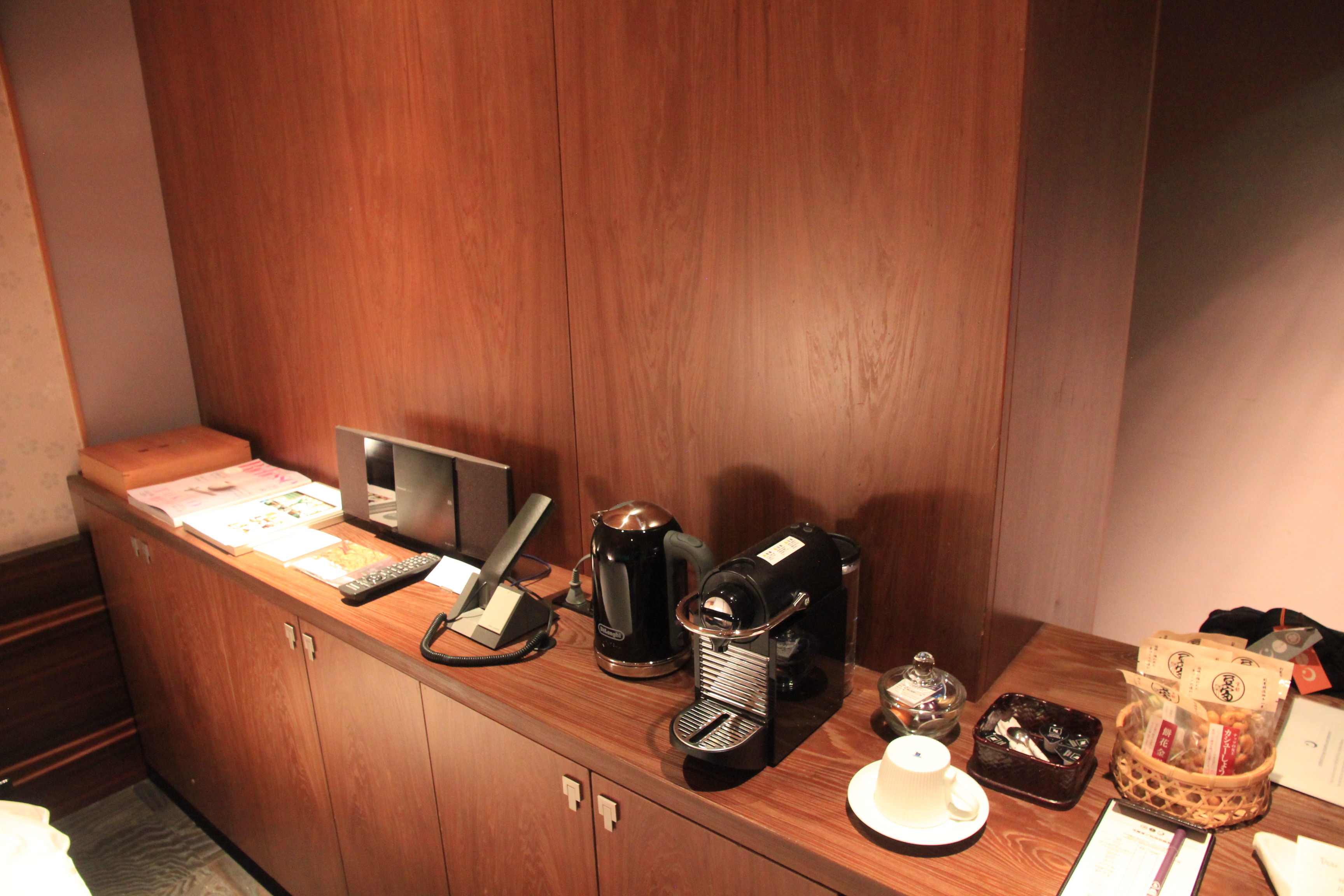 Im hinteren Teil befindet sich der Kleiderschrank. Da dieser mit dem Rücken in den Raum zeig, hat man das Gefühl, man hätte einen begehbaren Kleiderschrank. Auf der Rückseite befindet sich ein Sideboard. Neben einer Nespresso-Maschine liegt hier auch noch so einiges an Lesematerial. Die Philosophie ist, ganz klar, dass man sich entspannt. Aus diesem Grund gibt es im HOSHINOYA Kyoto keine Fernseher auf den Zimmern.