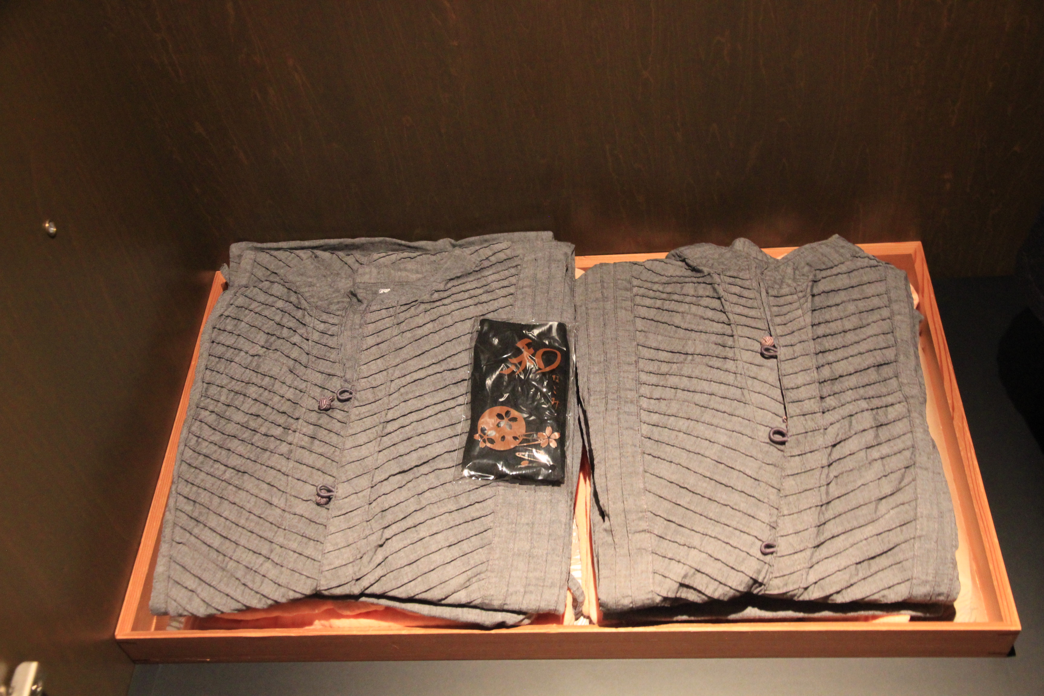 Wie auch schon in Tokio befindet sich im Schrank traditionelle japanische Kleidung. Diesmal war es zwar kein Kimono, aber dafür ein sehr bequemes Outfit. Interessanterweise laufen sehr viele Gäste in diesem Dress durch das HOSHINOYA Kyoto.