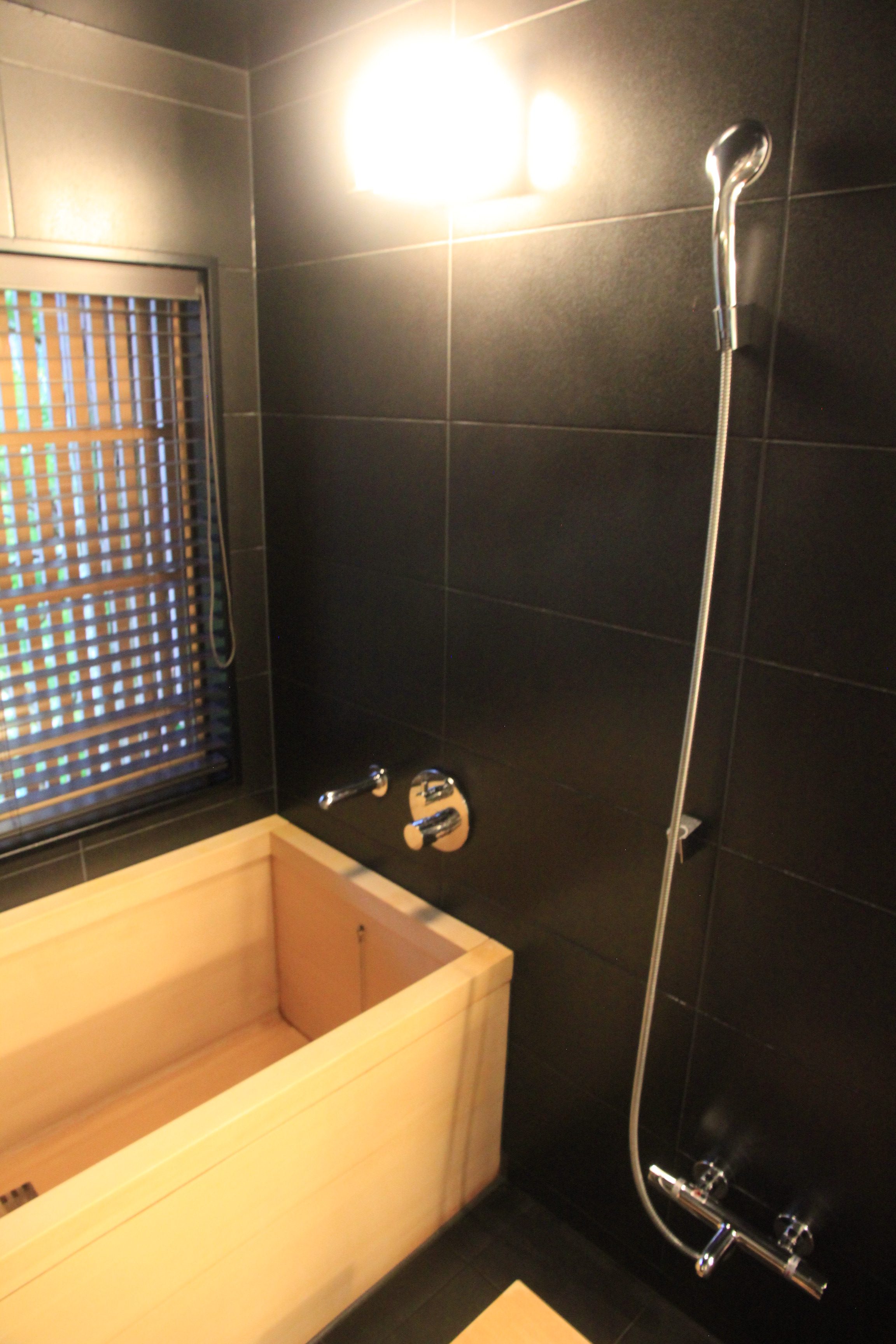 Die Dusche ist durch eine Glaswand vom Bad abgetrennt. Hier befindet sich ähnlich wie in einem Onsen eine Badewanne aus Holz, sowie die üblichen kleinen Hocker, auf die man sich beim Waschen setzt. Aus diesem Grund waren auch die Amaturen sehr niedrig angebracht.