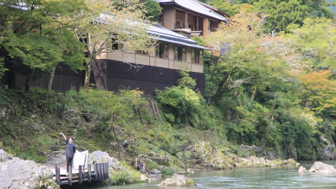 Nachdem ich am späten Vormittag ausgecheckt hatte, ging es für mich mit dem Shinkansen nach Kyoto. Für die gut 500 Kilometer braucht man mit dem japanischen Bullet Train nur gut 2 Stunden. Vom Bahnhof in Kyoto kann man entweder ein Taxi nehmen, das braucht dann knappe 30 Minuten, oder man fährt mit der Regionalbahn weiter. Letztere Option habe ich gewählt. Nach 10 Minuten Fußweg durch ein altes, historisches und entspanntes Viertel kam ich dann am Fluss an. Hier befindet sich das „Wartezimmer“ vom HOSHINOYA Kyoto. Man checkt hier nämlich ein, bevor man mit dem hoteleigenen Boot flussaufwärts zum Hotel gefahren wird. Nach circa 15 Minuten und einer wunderschönen Tour durch ein kleines Tal kommt man am Bootssteg des Hotels an.