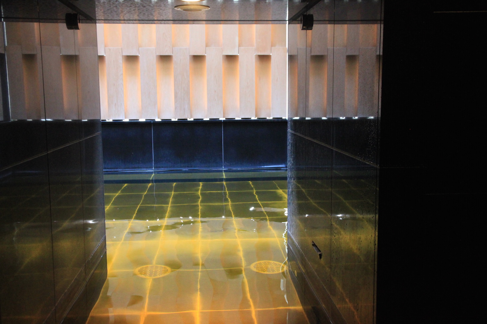 Es gibt einen großen Bereich, in dem man sich vor dem Baden abduscht un reinigt. Danach kann man in dem heißen Pool entspannen. Es gibt einen inneren und einen äußeren Teil. Letzterer ist nach oben hin komplett offen und man kann den Himmel sehen.