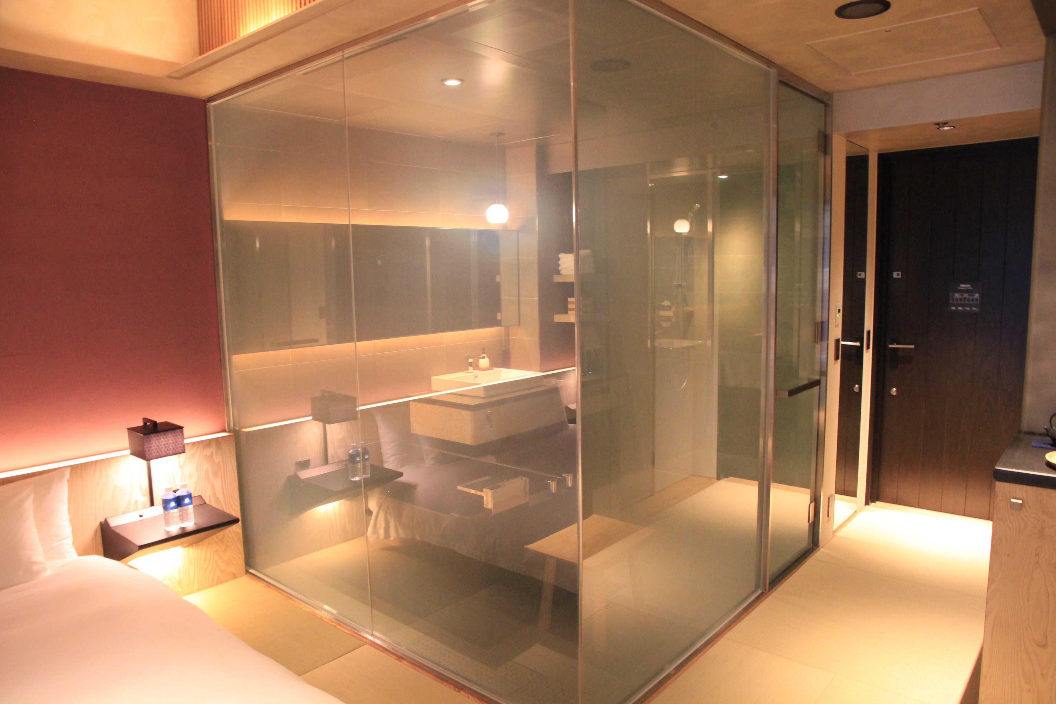 Das Bad befindet sich im Zimmer und ist durch eine Glaswand zum Schlafbereich abgetrennt. Allerdings lässt sich das Glas auf Knopfdruck in eine undurchsichtige Wand verwandeln. Im Bad befindet sich eine große Badewanne und ein Waschtisch mit einem einzelnen Waschbecken. Alle nötigen Amenities sind in den Schubladen verstaut.