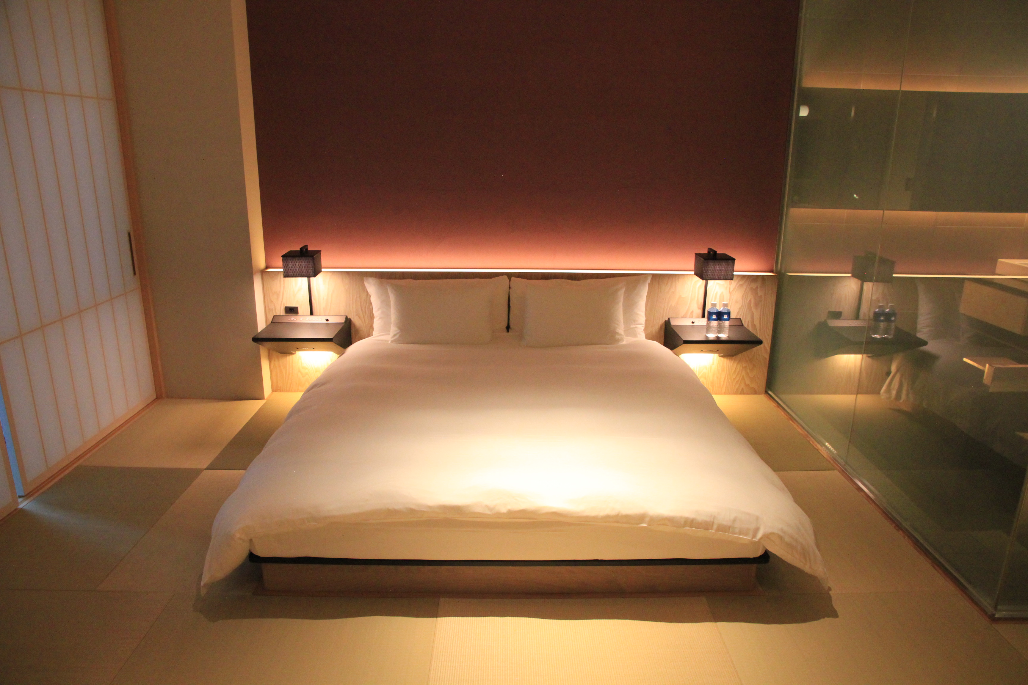 Während meines Aufenthaltes habe ich zwei Nächte im Sakura Zimmer gewohnt. Das Zimmer verfügt über ein großes und extrem bequemes Bett. Links und rechts daneben befinden sich die Nachttische mit kleinen Lampen, Steckdosen und den Controllern um das Licht zu dimmen, sowie die Jalousien einzustellen.