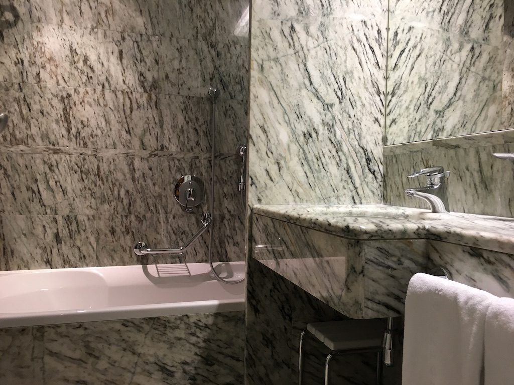 Das mit Marmor ausgekleidete Badezimmer bot eine Badewannen-Dusch Kombination, sowie an zwei Wänden große Spiegel, sodass sich ein großartiges Raumgefühl und eine interessante „optische Täuschung“ ergab, da sich das Badezimmer in den gegenüberliegenden Spiegeln in die „Unendlichkeit“ spiegelte – schwer zu erklären. 😉