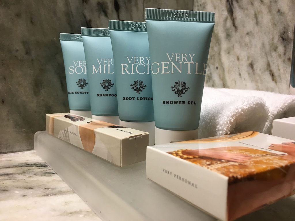 Neben Bademänteln, Hausschuhe wurden hochwertige Pflegeprodukte von Salon de Biosel angeboten und täglich erneuert.