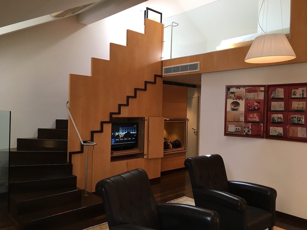 Der Wohnraum bot neben zahlreichen Schränken zur Ablage eine Minibar, einen Safe, ein interaktives TV-System, eine Tee-Station, sowie ausreichend reguläre und USB Steckdosen. Möbliert war der Bereich mit einem Schreibtisch, sowie einer Sitzecke mit großzügiger Couch und bequemen Ledersesseln.