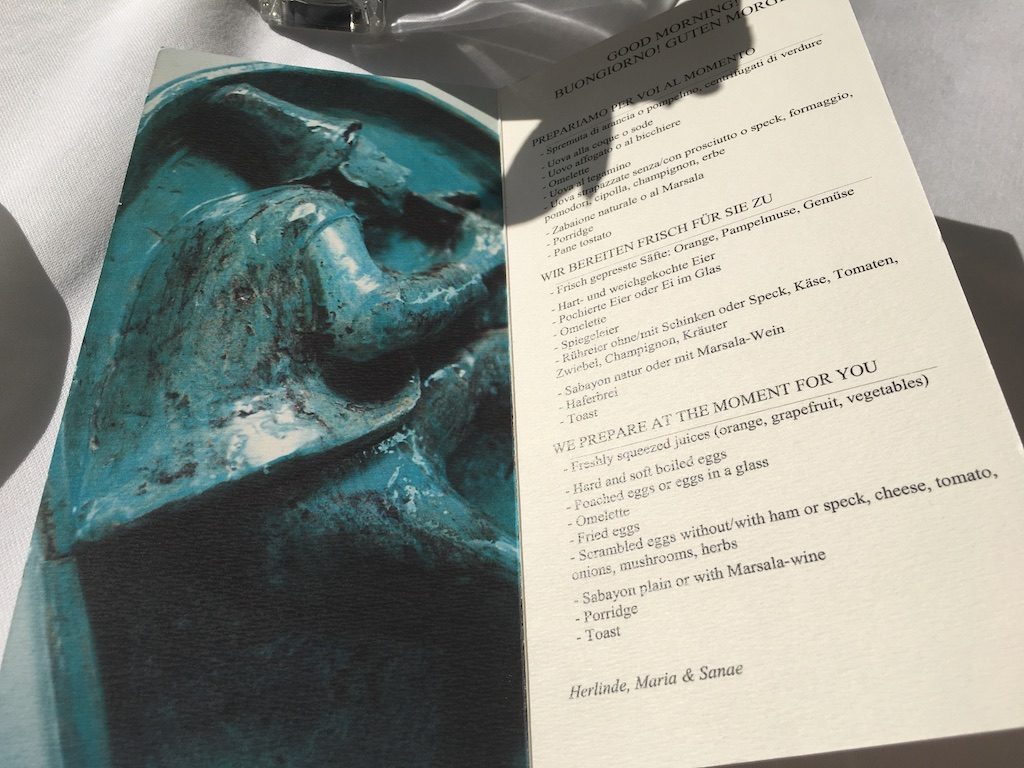 Aus der Küche direkt wurden Kaffeespezialitäten, Eierspeisen, sowie frisch gepresster Orangensaft auf die sonnige Terrasse neben dem Frühstücksraum geliefert. Lediglich am letzten Morgen im Hotel gab es Probleme mit der Zubereitung von Eierspeisen, sodass diese nicht wie gehofft geliefert werden konnten.