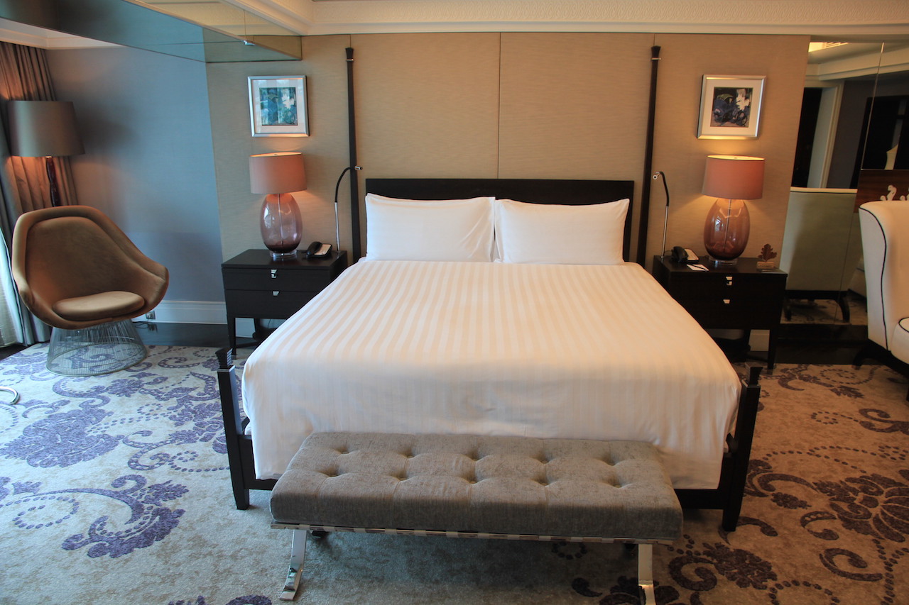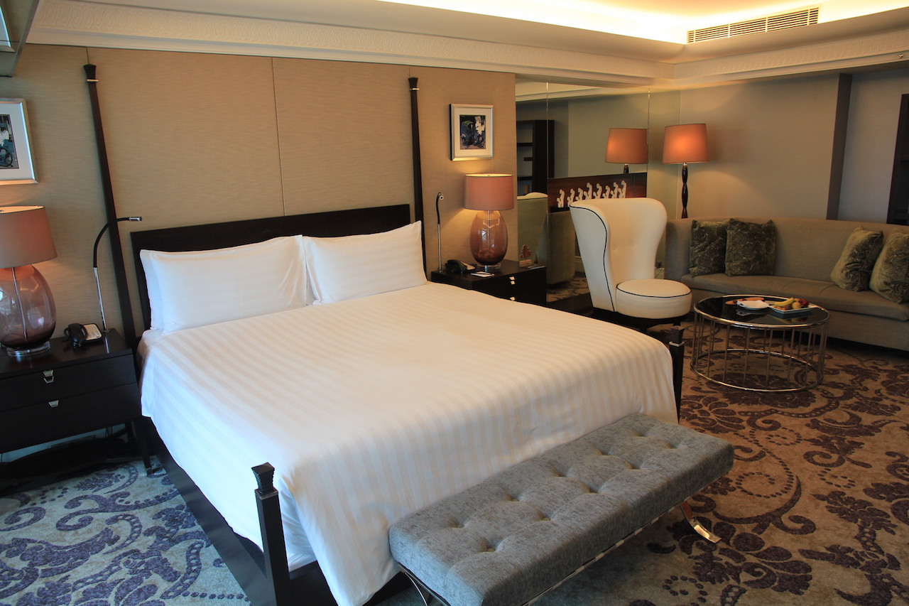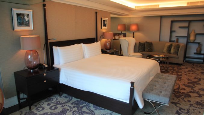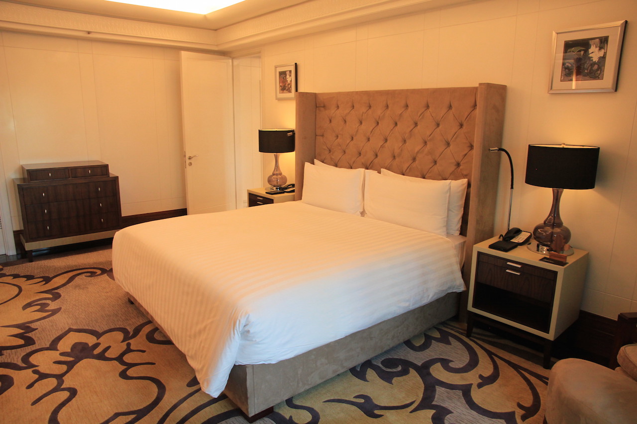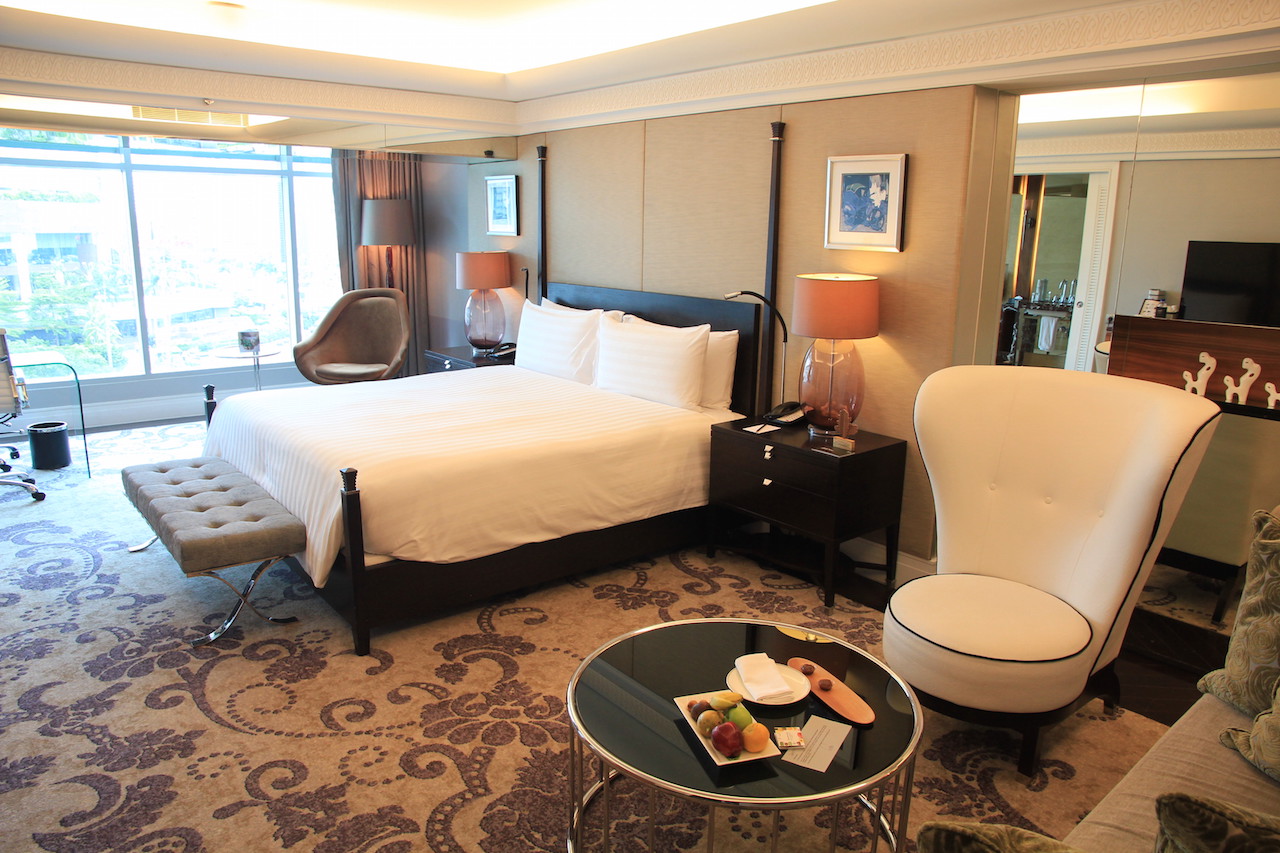 Wenn man das Hotel betritt, dann werden zuvor alle Koffer und Taschen gescannt. Vom Prozedere ist es mit einem Flughafen zu vergleichen. Auch die Wertsachen muss man kurz ablegen, wenn man durch den Scanner geht. In der Lobby angekommen habe ich an der Rezeption einige Augenblicke warten müssen, bis ich einchecken konnte. Nach wenigen Minuten hatte ich dann meine Zimmerkarte in der Hand. Ich wurde von einer der netten Damen nach oben zu meinem Zimmer begleitet. Ich bewohnte für meinen Aufenthalt einen 66 Quadratmeter großen Grand Deluxe King Room mit Zutritt zur Clublounge.