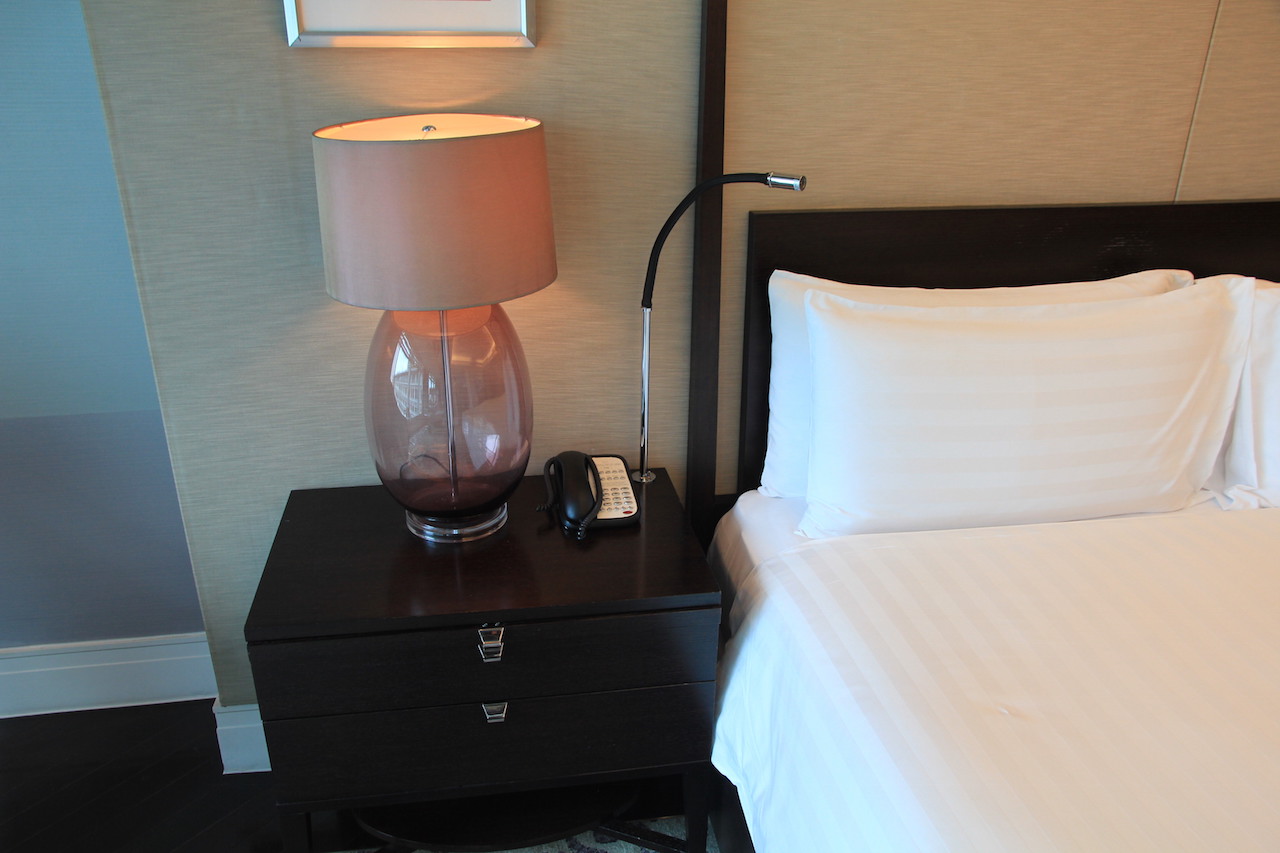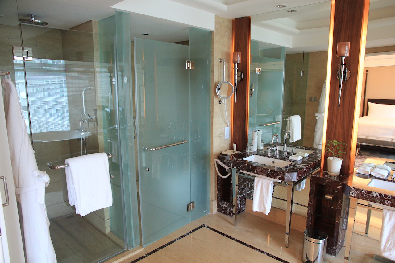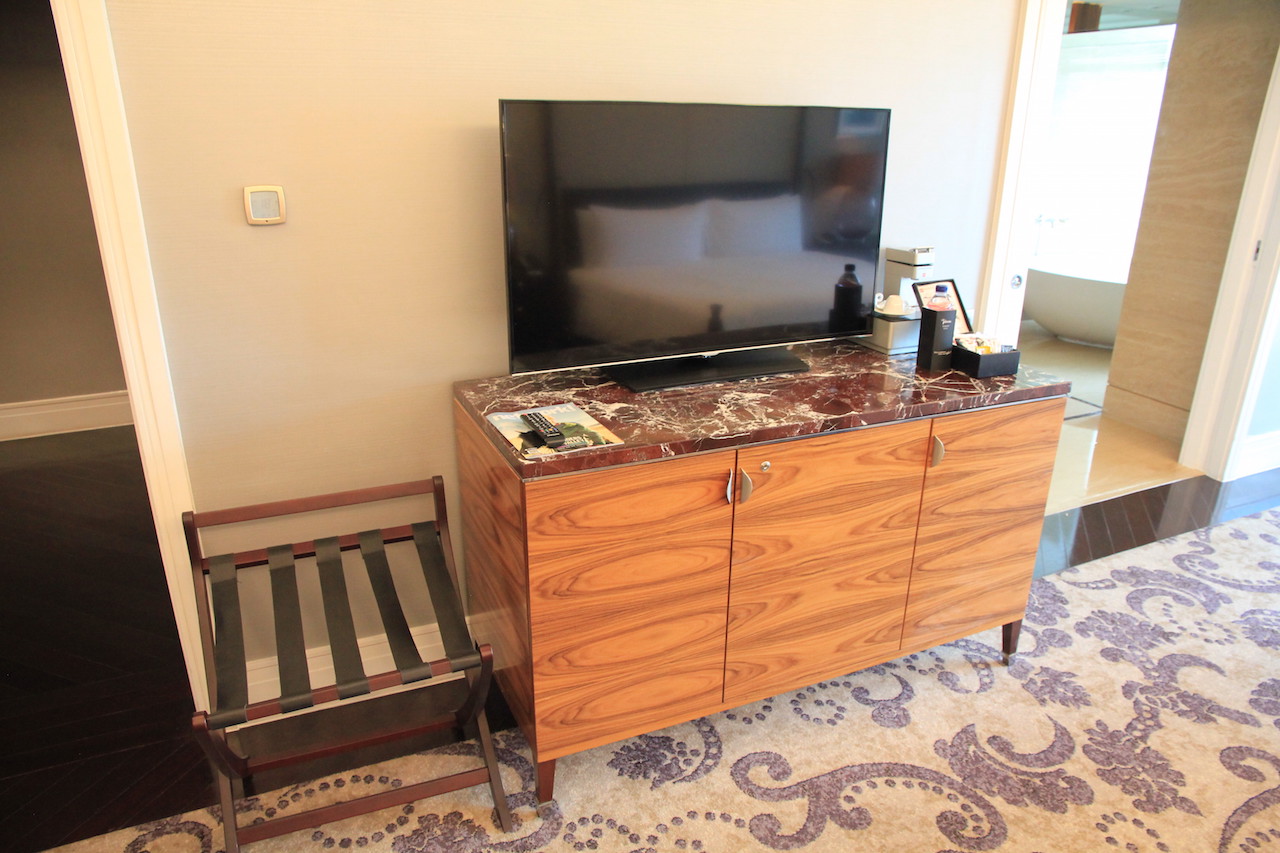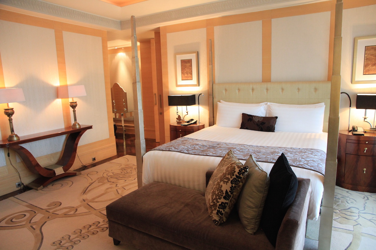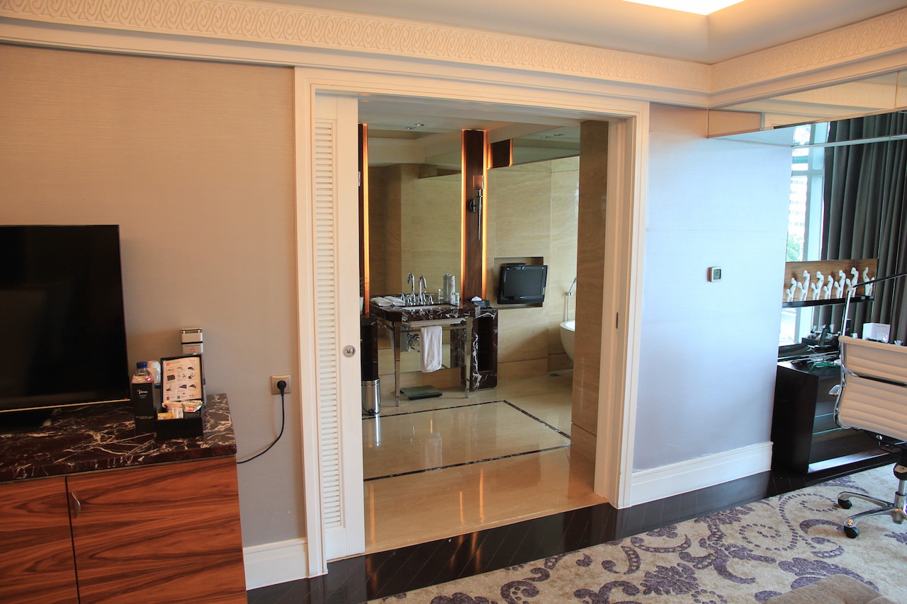 Wenn man das Hotel betritt, dann werden zuvor alle Koffer und Taschen gescannt. Vom Prozedere ist es mit einem Flughafen zu vergleichen. Auch die Wertsachen muss man kurz ablegen, wenn man durch den Scanner geht. In der Lobby angekommen habe ich an der Rezeption einige Augenblicke warten müssen, bis ich einchecken konnte. Nach wenigen Minuten hatte ich dann meine Zimmerkarte in der Hand. Ich wurde von einer der netten Damen nach oben zu meinem Zimmer begleitet. Ich bewohnte für meinen Aufenthalt einen 66 Quadratmeter großen Grand Deluxe King Room mit Zutritt zur Clublounge.