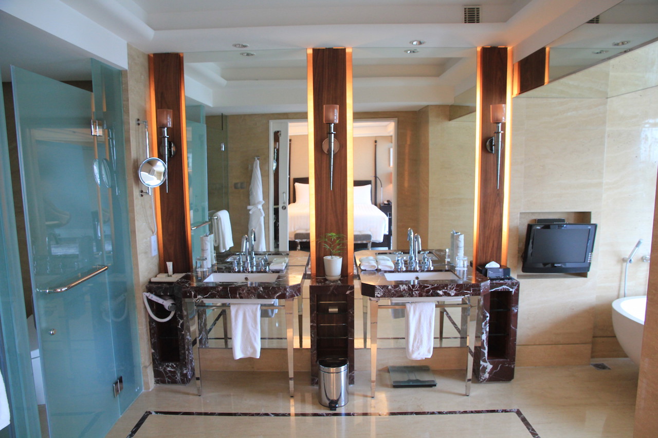 Gegenüber vom Bett befindet sich der Durchgang zum riesigen Badezimmer. Neben einem Doppelwaschbecken gibt es auch zwei Spiegel. Ein wenig mehr Ablagefläche hätte es für meinen Geschmack dann aber doch sein können. Die dunkelbraunen Marmorverkleidungen in Kombination mit dem Holz wirkt sehr edel und modern. Der Rest des Badezimmers ist mit beigem Stein gefliest.