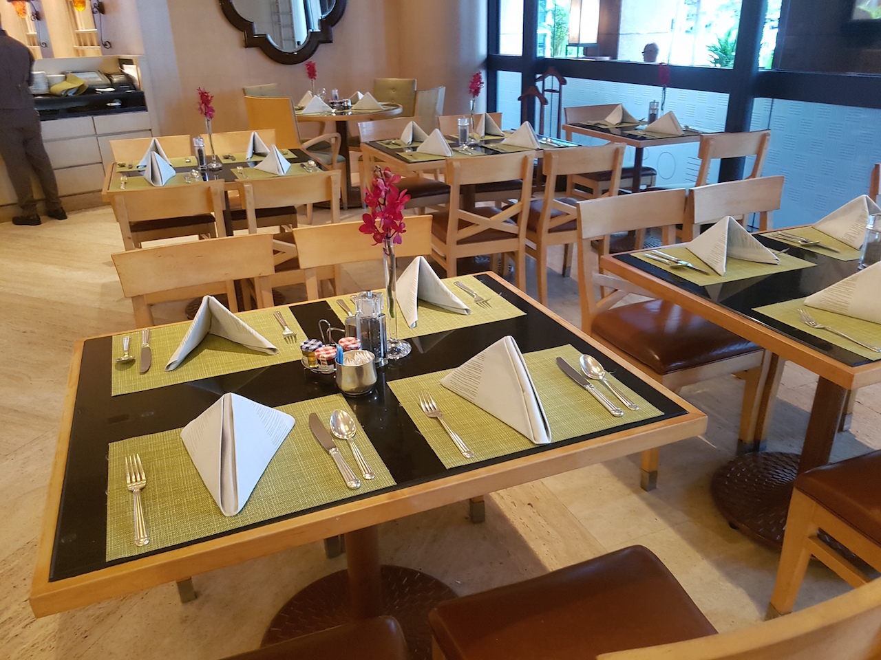 Wir haben aber unser Frühstück im Oscar’s, dem Hauptrestaurant im Conrad Centennial Singapur eingenommen. Dieses befindet sich im Erdgeschoss hinter dem Empfang. Wir wurden freundlich begrüßt und zu einen Platz im Außenbereich gebracht. Dort wurde dann sofort die Bestellung der Getränke aufgenommen. Das Frühstück ist als ein Buffet, an dem man sich selbst bedient, aufgebaut. Die Getränke werden aber am Platz serviert. Letzteres hat dann aber durchaus etwas länger gedauert, da wir mehrfach „übersehen“ wurden.