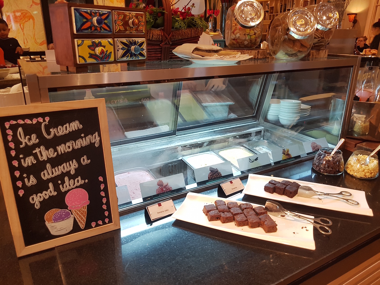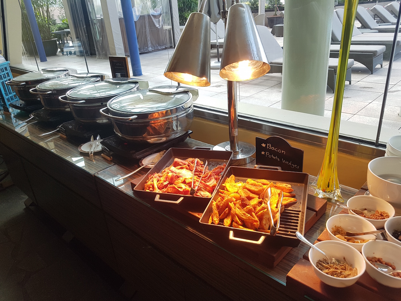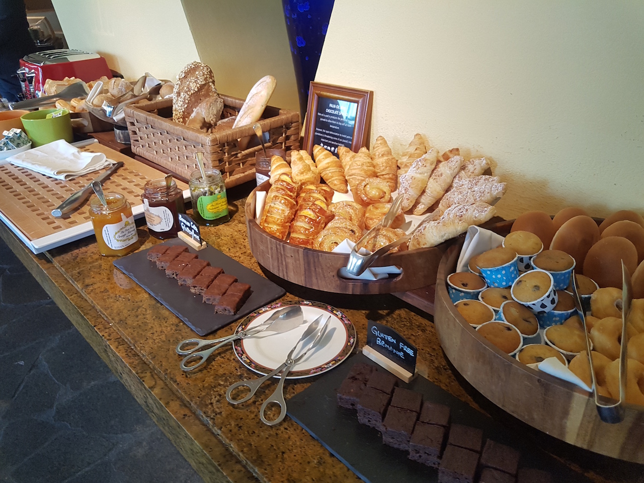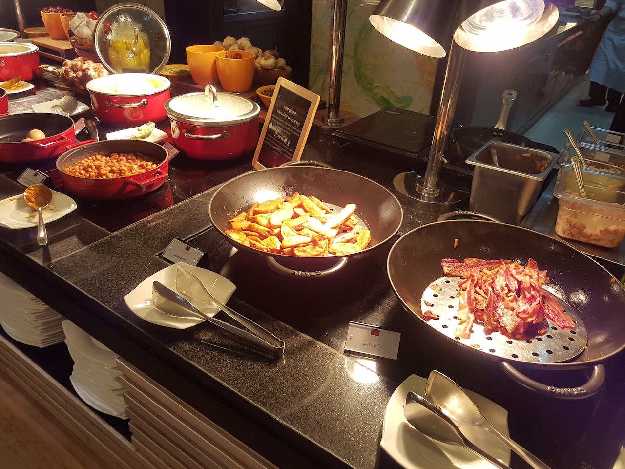 Am Morgen gibt es hier ein gutes Frühstück mit großzügiger Auswahl und eine Station für Eierspeisen. Am Abend werden Snacks und alkoholische Getränke serviert.