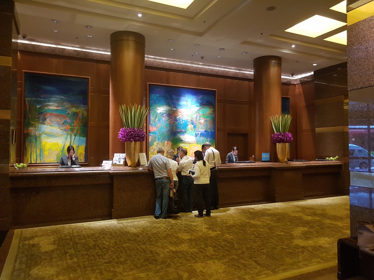 Als wir im Hotel ankamen begaben wir uns direkt zum Empfang. Dieser liegt auf der rechten Seite der Lobby. Wir mussten unseren Pass vorzeigen und die Anmeldung teilweise ausfüllen und unterschreiben. Allerdings war schon alles vorbereitet weshalb es nur wenige Minuten dauerte. Am späten Abend möchte man natürlich nur noch ins Bett, weshalb man einfach ungern warten will. Man erklärte uns noch kurz wo sich alles befindet und nach wenigen Minuten waren wir auf dem Weg in unser Zimmer im 12. Stock. Warum es bei vielen Hotels nicht Standard ist, dass die Dokumente und Formulare bereits vorbereitet sind, ist mir nicht erklärlich. Im Conrad Centennial Singapur hat der Check-In aber einwandfrei funktioniert.