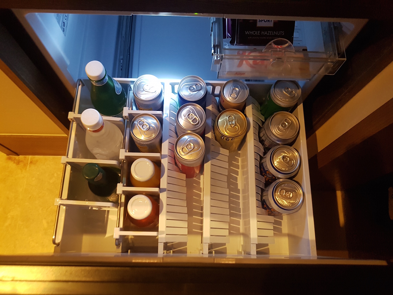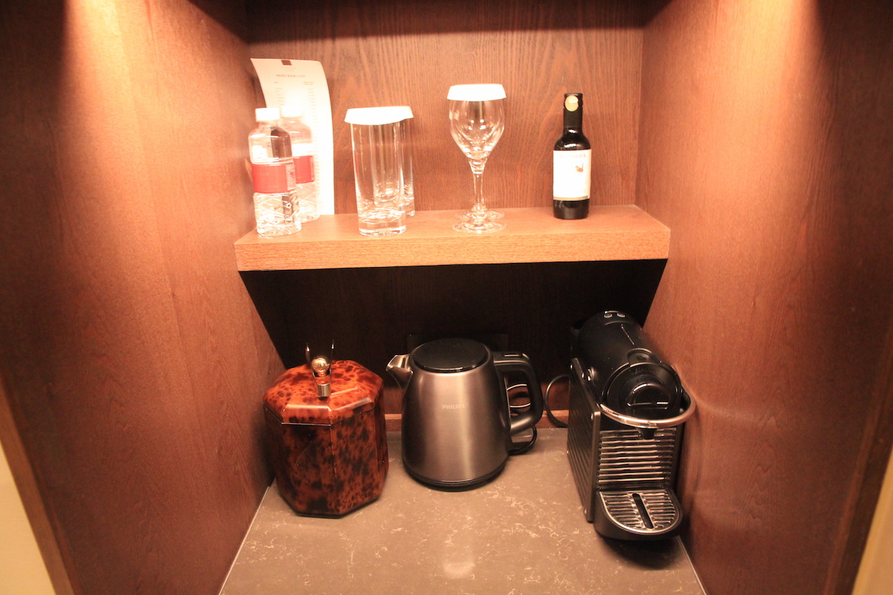 Im Gang befindet sich auch noch ein in die Wand integriertes Regal. Es gibt neben einer Nespresso Maschine auch einen Wasserkocher für Tee. Hier ist auch die Minibar verbaut. Gut finde ich, dass sich der Kühlschrank wie eine Schublade öffnen lässt. So kann man alles einfacher herrausnehmen.