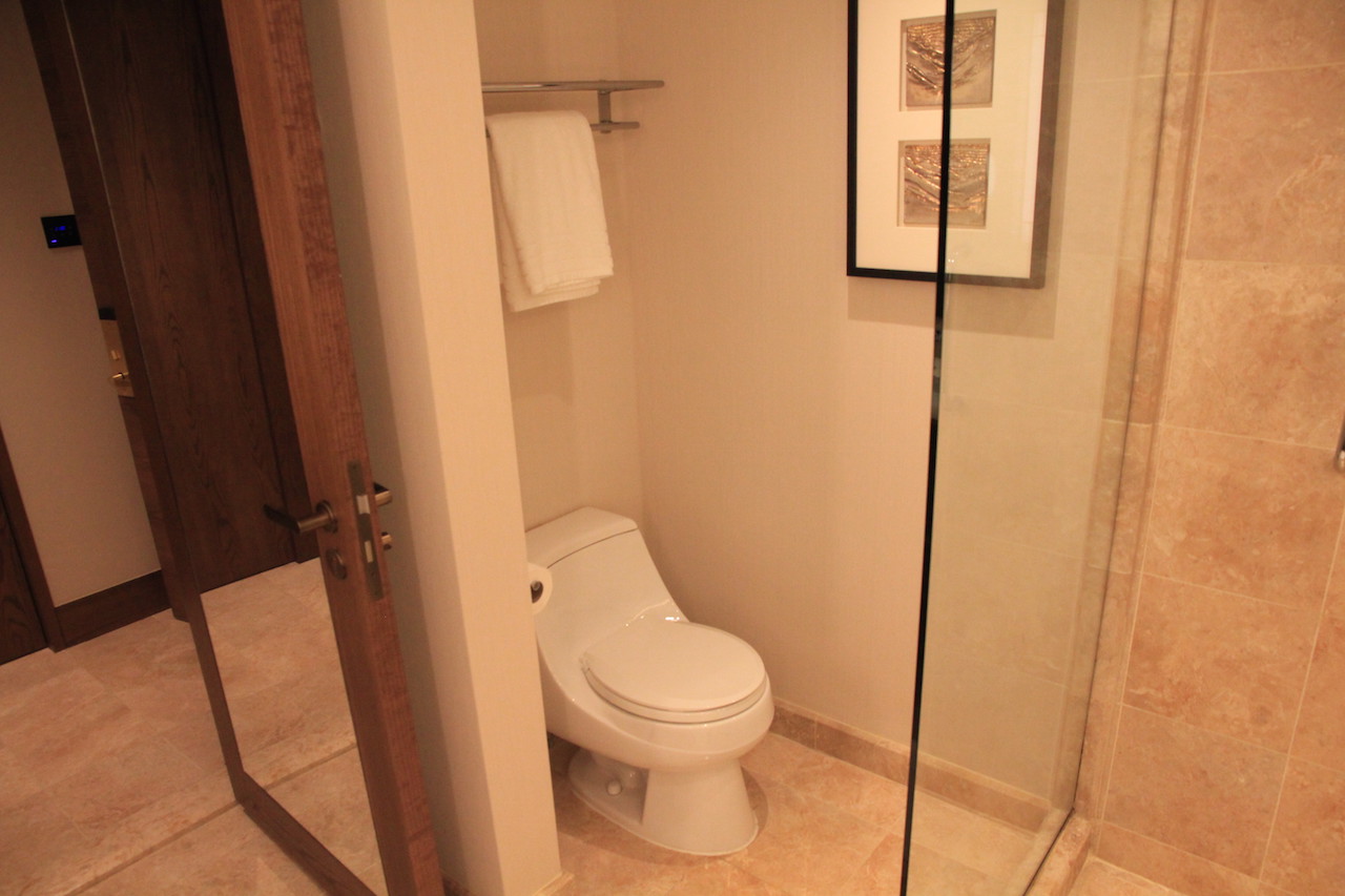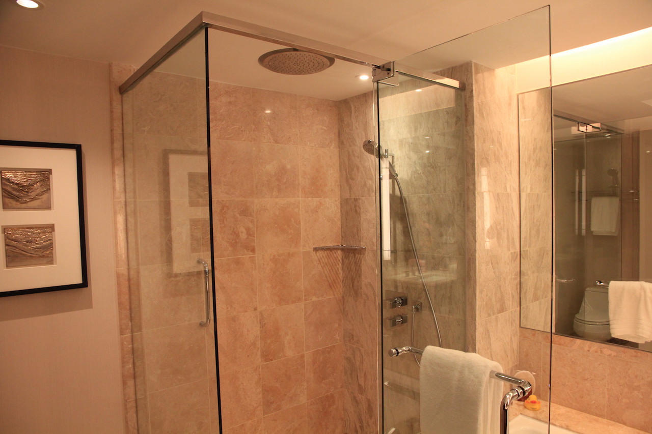 Wenn man das Zimmer betritt, dann befindet sich auf der linken Seite zunächst das Badezimmer. Dies ist eines der wenigen Dinge im Hotel, die nicht komplett neu renoviert wurden. Die beigen Steine wurden jedoch aufbereitet und alle Möbel wurden durch neue, ersetzt.