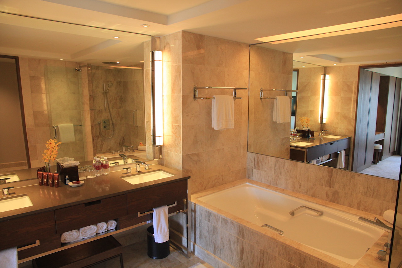 Auf der rechten Seite befindet sich ein großes Doppelwaschbecken mit genügend Ablagefläche. Die Pflegeprodukte stammen aus dem Hause Shanghai Tang. Was mir auch gefallen ist, war die Aufmerksamkeit zum Detail. Man hat uns sogar ein kleines Pflegeset für unseren Sohn hingestellt. Das habe ich bisher so nicht erlebt.