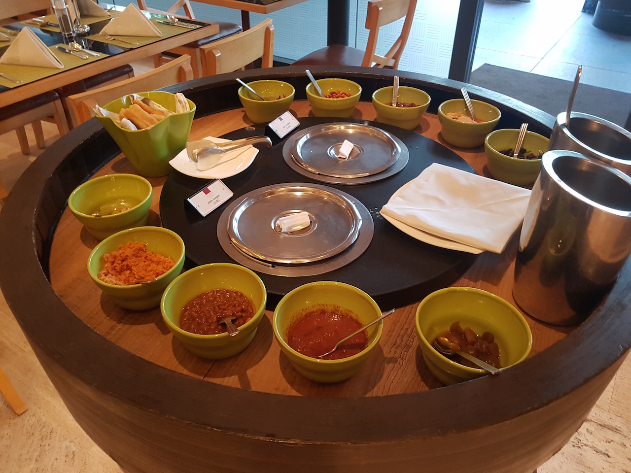 Wir haben aber unser Frühstück im Oscar’s, dem Hauptrestaurant im Conrad Centennial Singapur eingenommen. Dieses befindet sich im Erdgeschoss hinter dem Empfang. Wir wurden freundlich begrüßt und zu einen Platz im Außenbereich gebracht. Dort wurde dann sofort die Bestellung der Getränke aufgenommen. Das Frühstück ist als ein Buffet, an dem man sich selbst bedient, aufgebaut. Die Getränke werden aber am Platz serviert. Letzteres hat dann aber durchaus etwas länger gedauert, da wir mehrfach „übersehen“ wurden.