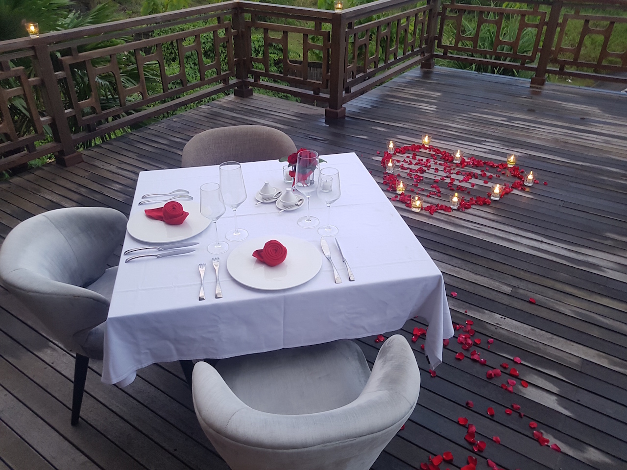 Am letzten Abend auf Bali haben wir ein tolles, romantisches Abendessen gehabt. Hier waren wir selbst überrascht, wie schön alles dekoriert war. Das Essen hatten wir bereits Mittags reserviert und uns die Gerichte ausgesucht. Da wir draußen gegessen haben und es recht dunkel war, kommen die Bilder leider nicht so gut rüber. Das bitte ich zu entschuldigen.