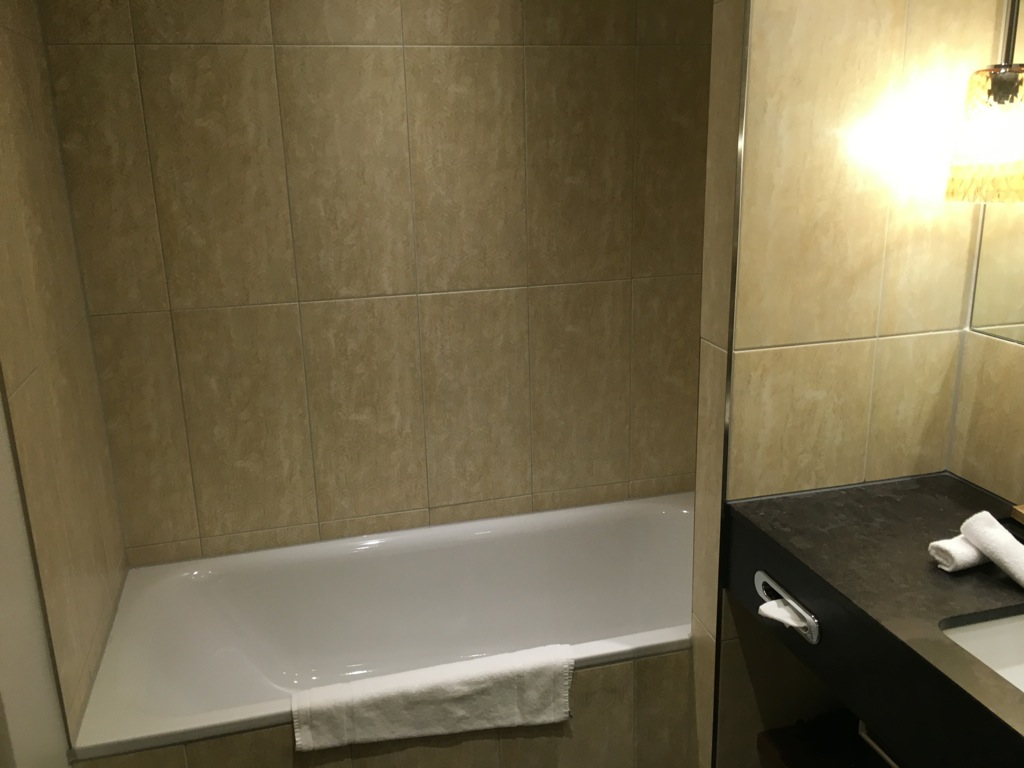Das Bad ist ausreichend groß und verfügt sowohl über eine Badewanne, als auch über eine Dusche. Da der Reichshof ja ein Curio by Hilton ist, findet man im Bad nicht die Hilton Amenitys von Peter Thomas Roth, sondern Amenitys der Marke NOIR. Was ich persönlich als Stilbruch empfinde, sind allerdings die Spender für Shampoo und Conditioner in der Dusche und am Waschbecken. Allerdings muss man diese nicht verwenden, da selbiges ja auch in kleinen Fläschchen zur Verfügung gestellt wird.