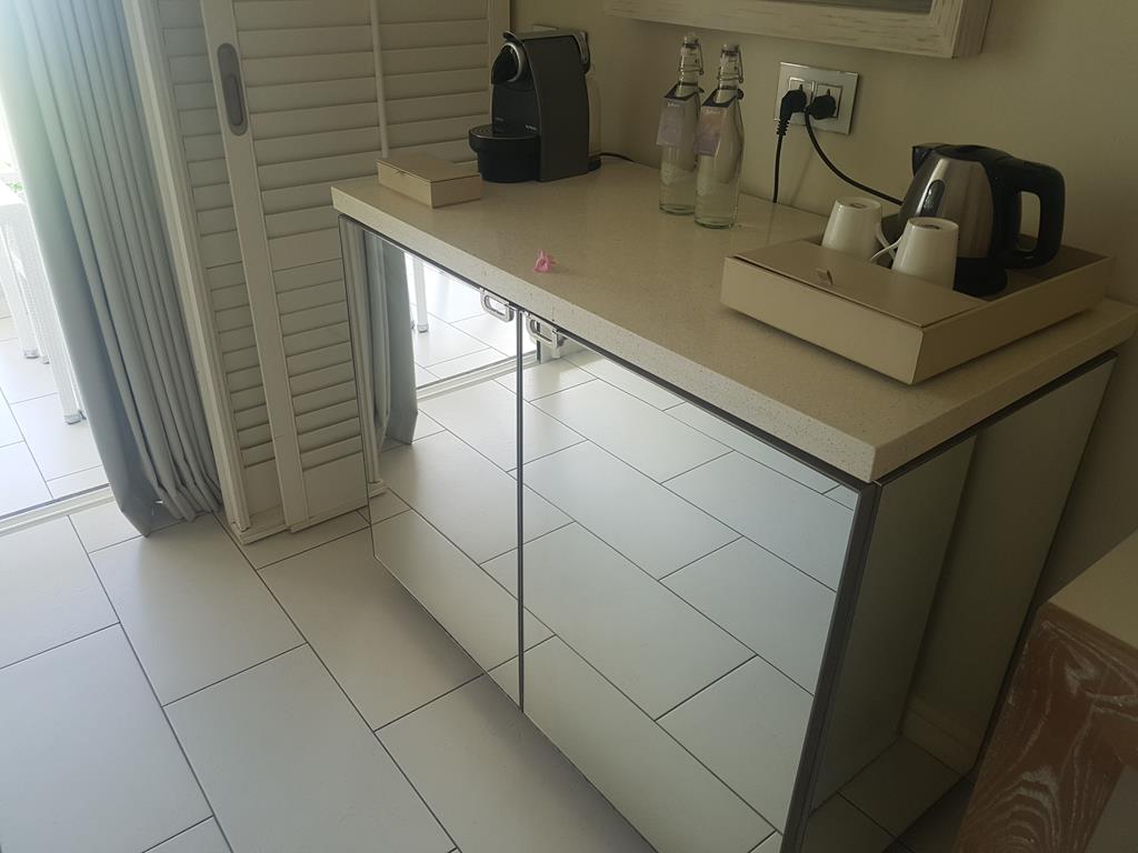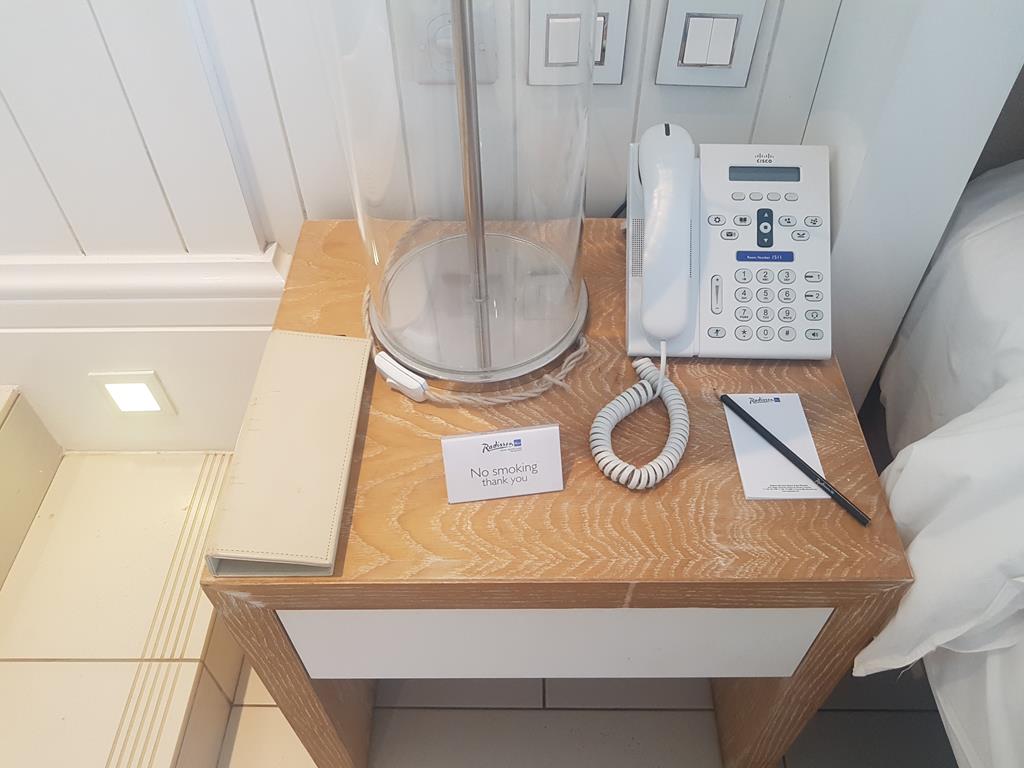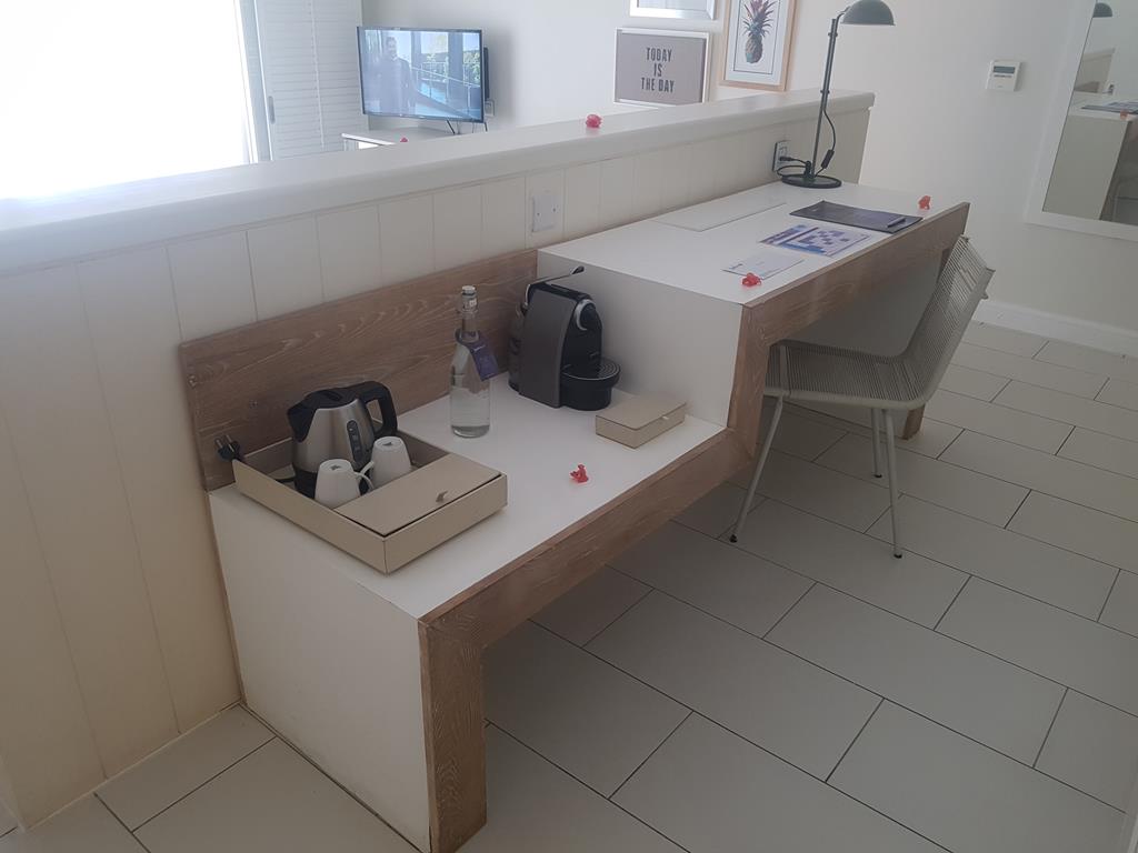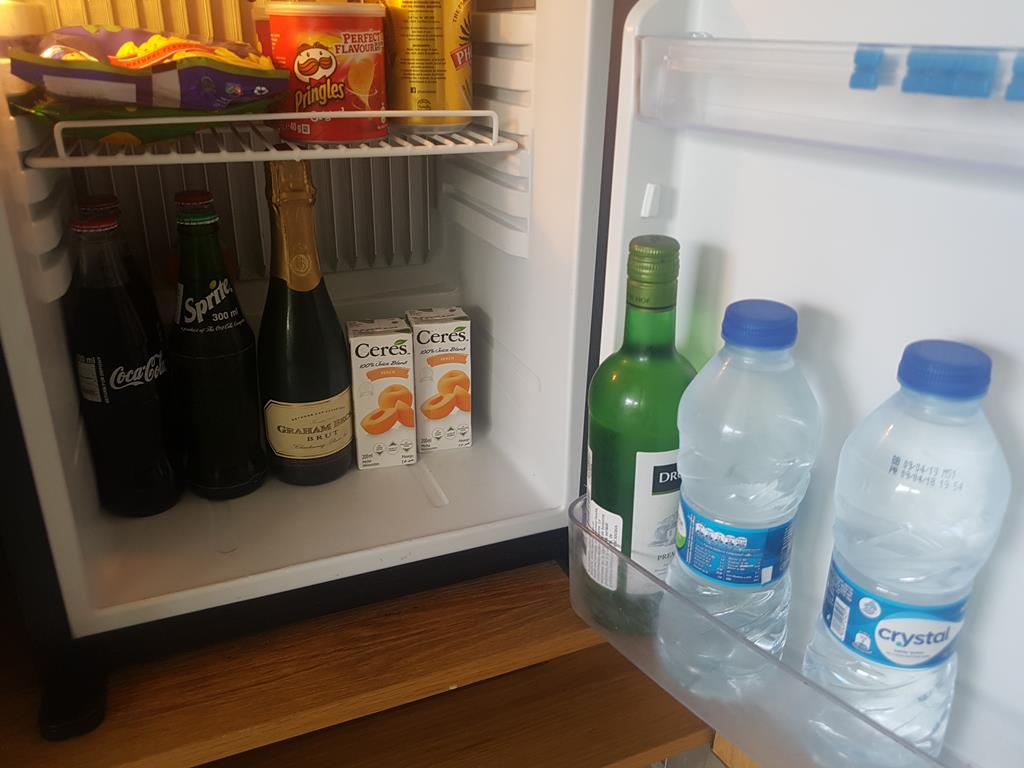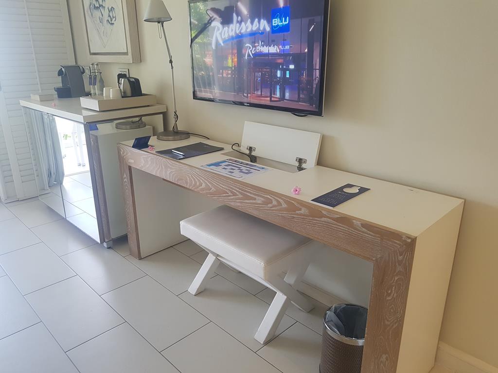 Gegenüber von Bett befindet sich ein großer Schreibtisch mit Kommode. Hier ist auch die Minibar verbaut. Im Schreibtisch gibt es einige Steckdosen. Diese haben leider nur zum Teil funktioniert. So war es nicht immer ganz einfach die elektronischen Geräte aufzuladen.