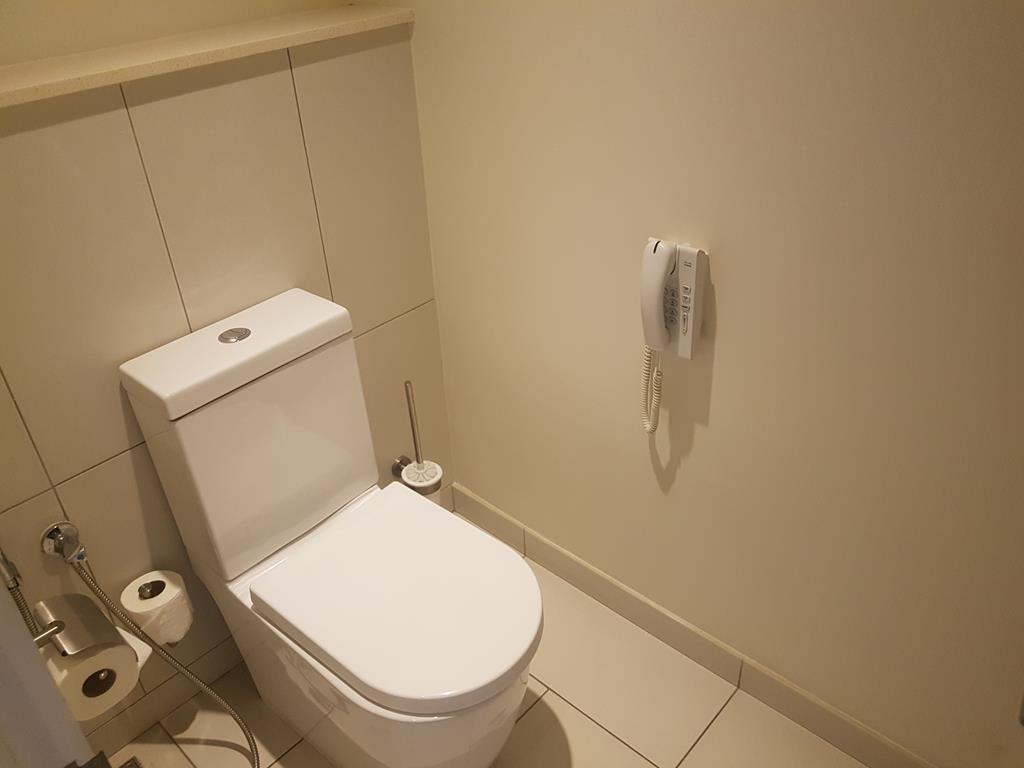 Unser Zimmer 1511 lag im zweiten Stock. Wenn man es betritt, befindet man sich zunächst in einem langen Flur, der zum eigentlichen Zimmer führt. Hier befindet sich links die Toilette. Dahinter liegt ein großer mit Spiegeln verkleideter Einbauschrank.