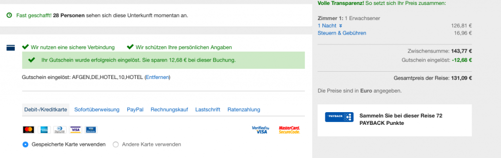 Wenn Ihr ein passendes Hotel ausgesucht habt, müsst Ihr auf der Zahlseite über Euren Kreditkarteninformationen den Gutschein Code: AFGENHOTELFERIEN eingeben und auf „Gutschein einlösen“ klicken. Die 10% vom Zimmerpreis werden anschließend automatisch abgezogen.