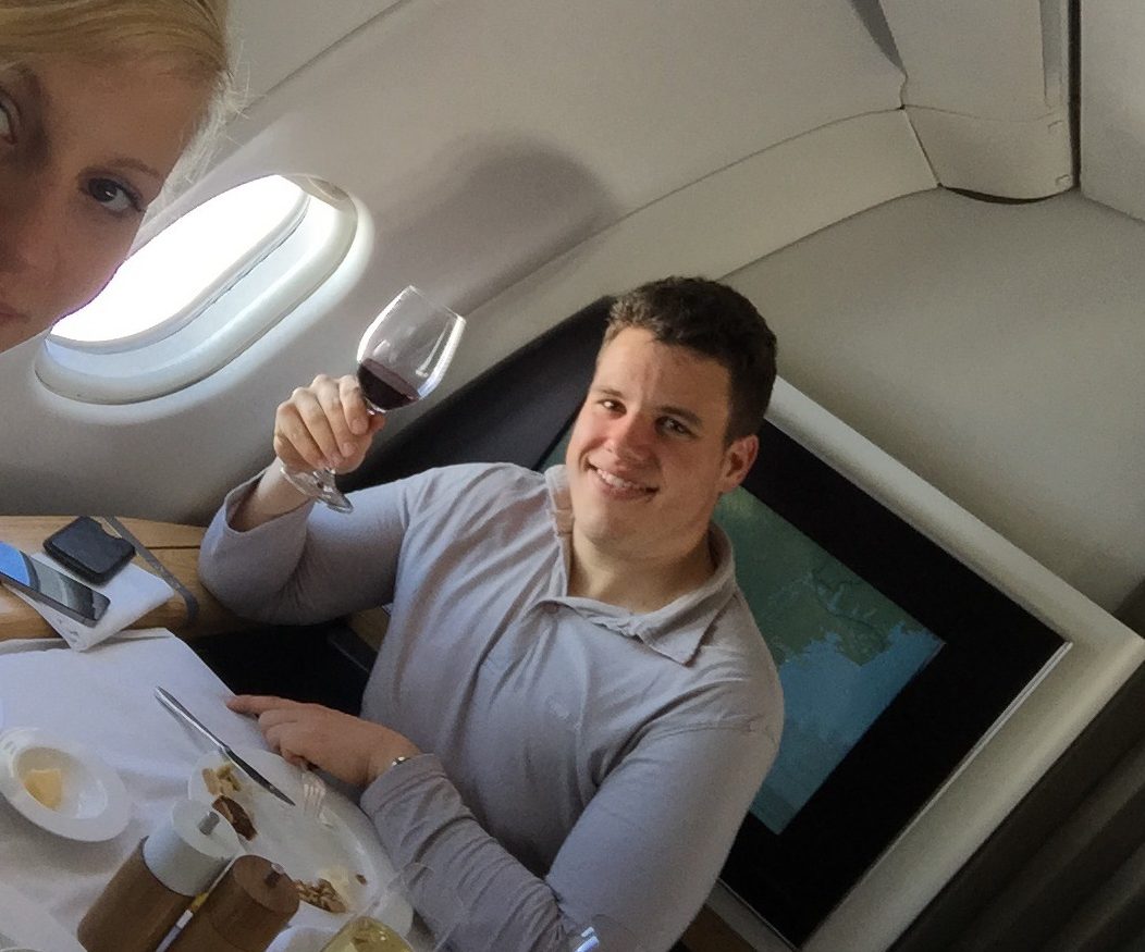Ein paar Tage vor meinem Geburtstag überreichte er mir ein kleines silbernes Briefchen. Erst beim näheren Hinschauen erkannte ich den roten Rand mit der Aufschrift „First Class“. Ich habe natürlich erst mal eher ablehnend reagiert. Nach so einer kurzen Zeit so ein großes Geschenk? Das war außerhalb meines Vorstellungsvermögens. Nachdem er mit dann aber erklärt hatte, dass das Ticket „nicht so wirklich“ bezahlt ist und er anschließend nicht Meilen-Insolvenz anmelden muss, habe ich mich darauf eingelassen.