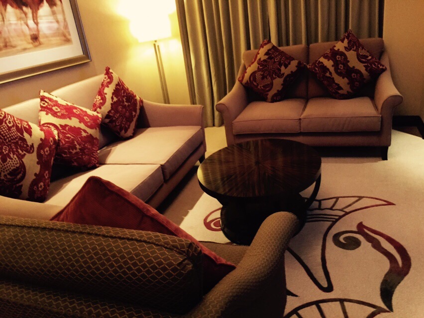 In Dubai angekommen fuhren wir zum Conrad Dubai, einem Hotel der Hilton Kette. Natürlich wusste ich auch nicht, dass man auch bei Hotels Punkte sammeln kann und ein „Jemand“ werden kann. So wurden wir in eine wunderschöne Suite mit Blick auf den Burj Khalifa upgegradet. Das Hotel alleine ist ja schon sehr beeindruckend mit seiner riesigen Empfangshalle und den edlen Möbeln, die Suite jedoch, war noch eine Nummer höher. In der Suite wartete sogar eine Geburtstagstorte auf mich. Ich war nicht nur von dem Luxus beeindruckt, sondern auch von dem Aufwand den Christoph nur für mich betrieben hatte.