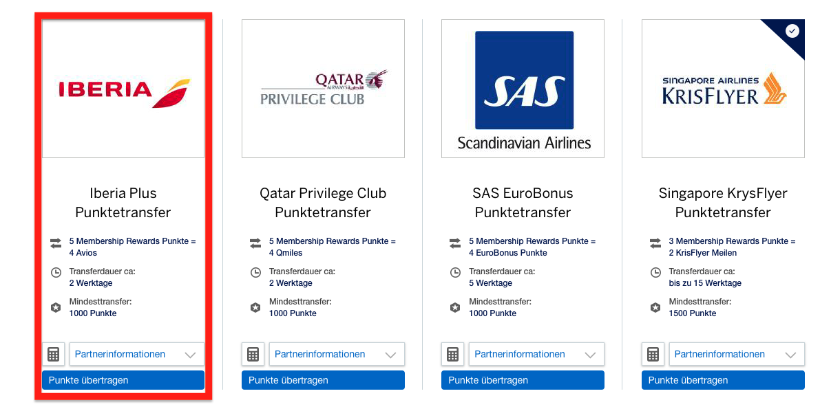 Membership Rewards Punkte sind extrem flexibel und lassen sich zu einer Reihe von Airlines transferieren, meist in einem Tauschverhältnis von 5:4. Die 40.000 Membership Rewards Punkte ergeben also 32.000 Vielfliegermeilen, mit welchen man Freiflüge buchen kann. Einer der 11 Transferpartner ist das Vielfliegerprogramm von Iberia, Iberia Plus.