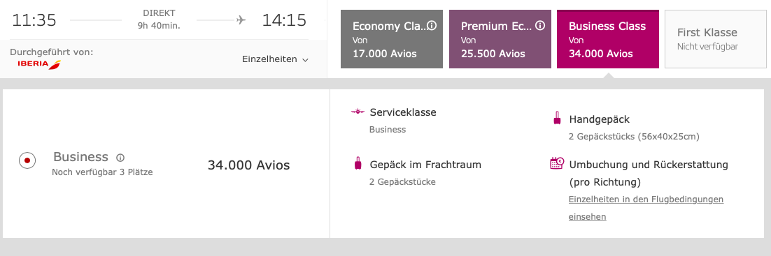 Eine schlechte Nachricht aber gleich vorab: Um diese sehr niedrigen Werte zu erreichen, muss man die Flüge in Madrid starten oder beenden, ein Zubringer aus Deutschland, Österreich oder der Schweiz würde in der Business Class 15.000 Avios (pro Richtung) oder in der Economy Class 7.500 Avios (pro Richtung) extra kosten. Da man aber Hin- und Rückflüge von fast jedem Flughafen in Deutschland schon für um die 100 Euro bekommt, kann man dies auch mit einem separaten Ticket bewerkstelligen.