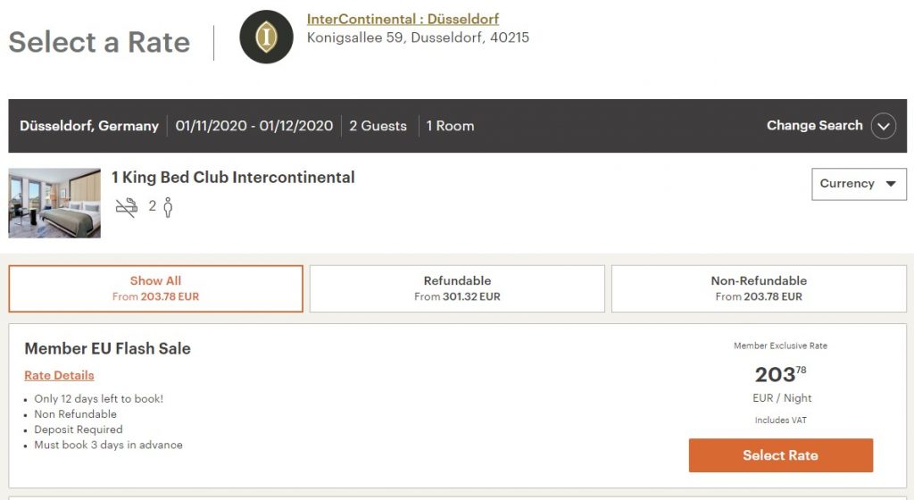 Ich bin bis heute nicht durch die Tarif-Struktur bei IHG durchgestiegen. Mal läuft ein Sale und der Preis abzüglich Rabatt liegt dennoch höher als eine normale Frühbucher-Rate. Das InterContinental Düsseldorf ist dafür ein hervorragendes Beispiel. Und plötzlich bei dem aktuellen „New Year Sale“ ist es tatsächlich das erste Mal so, dass der Angebots-Tarif auch im InteContinental Düsseldorf mit Abstand der günstigste Preis ist (siehe Beispiel oben).