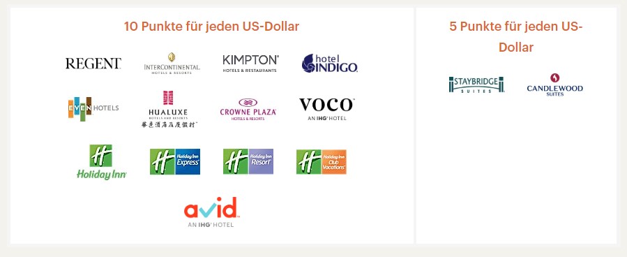 Der einfachste Weg, um an IHG One Rewards Punkte zu gelangen, liegt auf der Hand: Bucht ein Hotelzimmer über einen Direktbuchungskanal aus dem Portfolio von IHG. Soweit es sich dabei um eeine qualifizierte Rate handelt und Ihr auch tatsächlich im Hotel eincheckt, bekommt Ihr 10 Punkte pro USD Umsatz gutgeschrieben. Ausnahmen machen hier lediglich die Staybridge Suites und Candlewood Suites, die nur 5 Punkte pro USD gutschreiben.