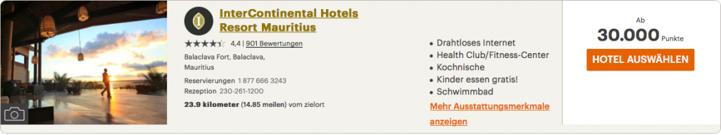 Das InterContinental Mauritius, das ich für einen Urlaub in Betracht gezogen habe, hätte mich 292,50 Euro pro Nacht gekostet. Alternativ kann man das Hotel auch für 30.000 Punkte buchen, die man dank dieser Aktion für 132 Euro kaufen kann. Man spart also 50% des Zimmerpreises.