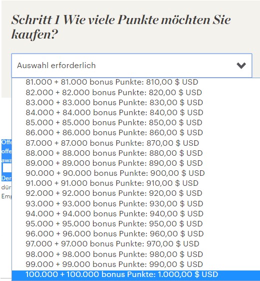 - Maximale Anzahl zu kaufende Punkte: 100.000 plus 100.000 Bonus = 200.000 Punkte