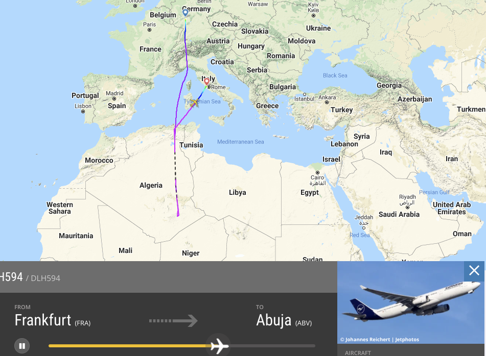 Ebenfalls am vergangenen Freitagnachmittag musste ein Lufthansa Airbus A330-300 über Algerien umkehren. Die Maschine mit dem Kennzeichen D-AIKI war als Flug LH594 unterwegs nach Abuja (ABV). Etwa drei Stunden nach dem Start wurde Algerien überflogen, der Zweistrahler wendete und flog zunächst die gleiche Route zurück.